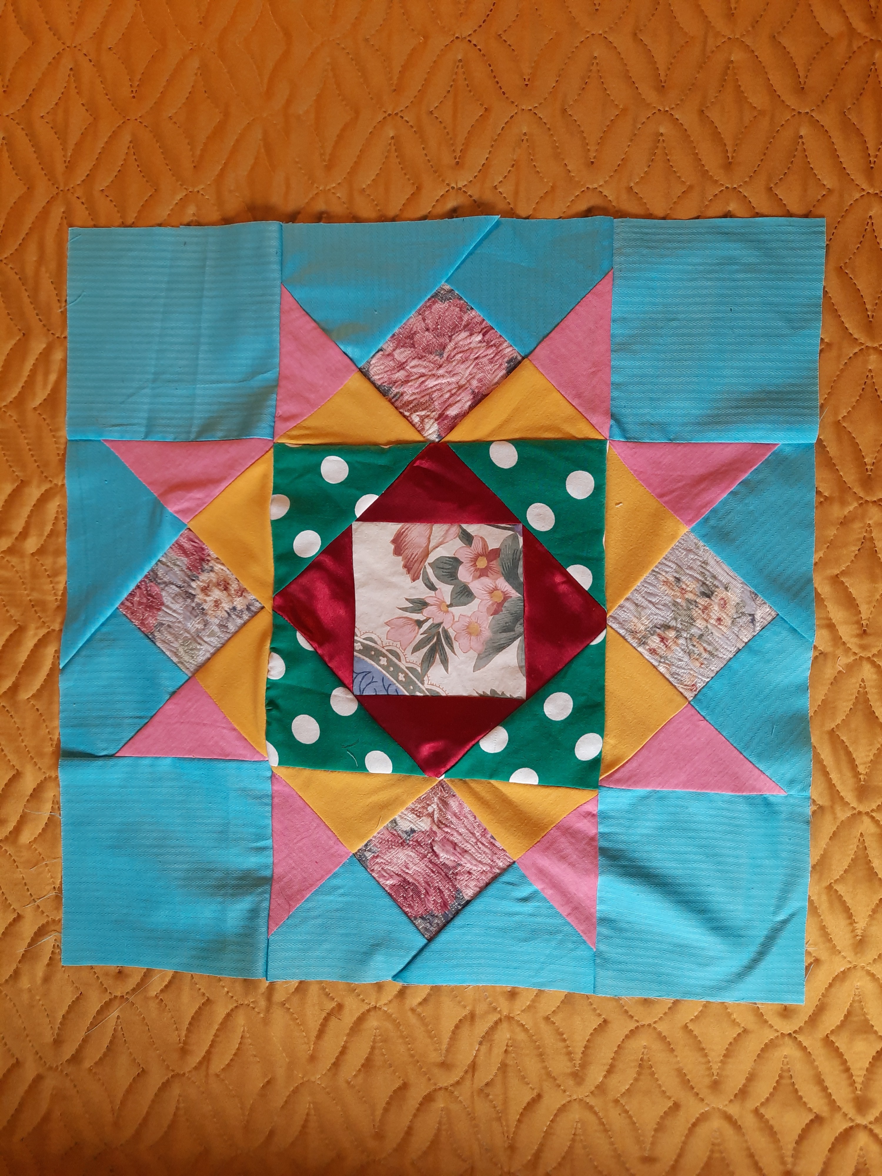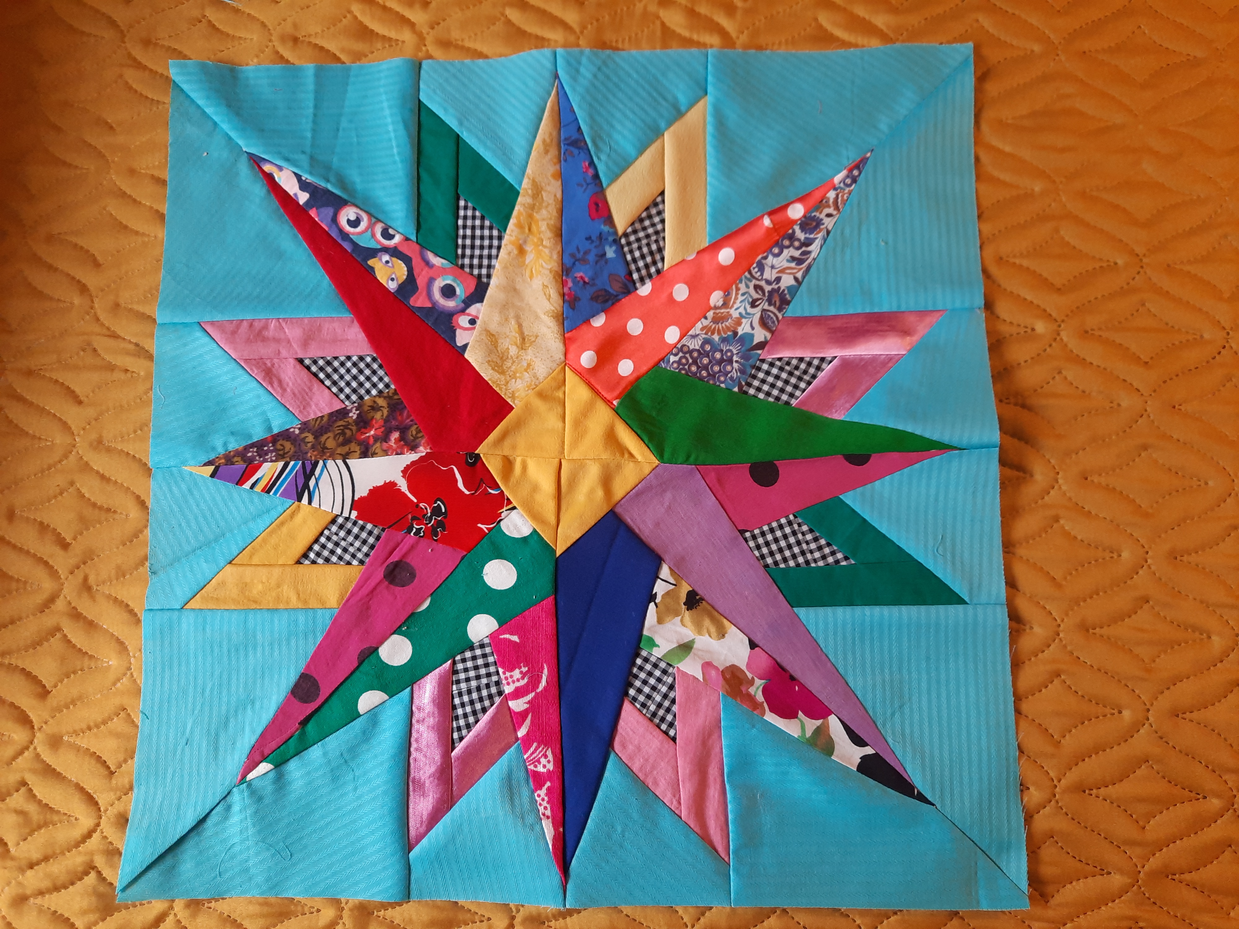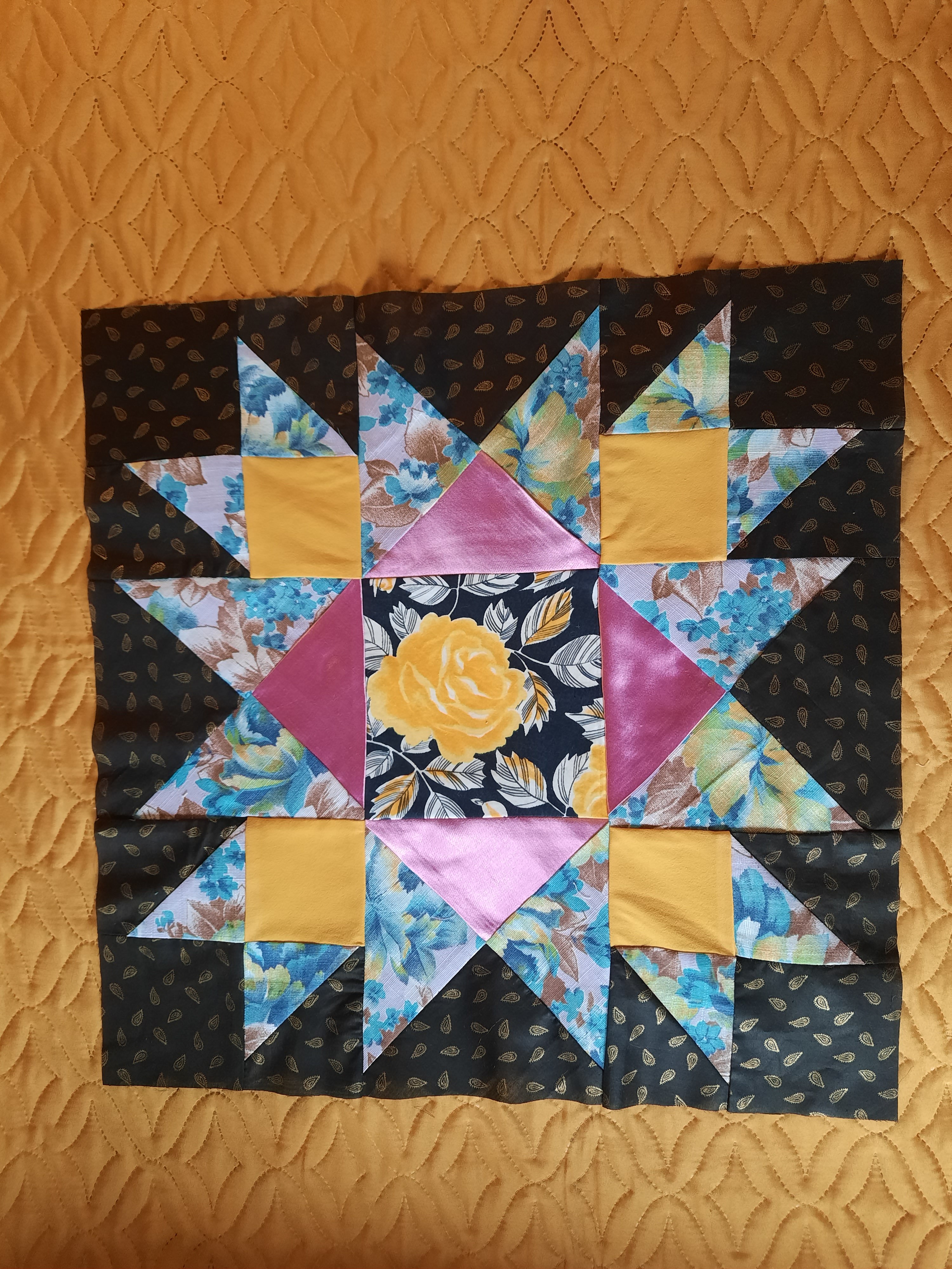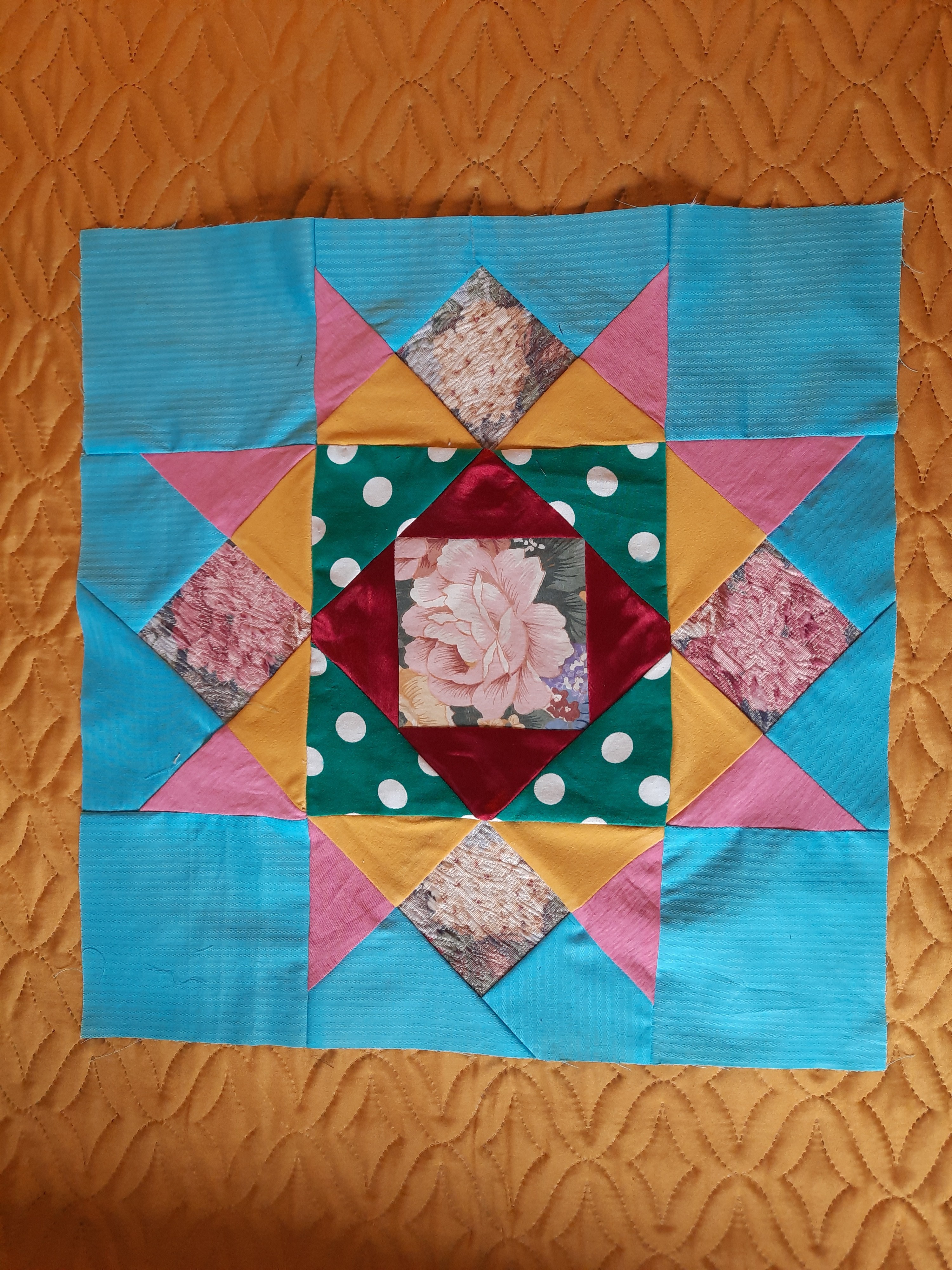 Готовлюсь к пошиву нового одеяла под названием "День и ночь".Такое название возникло из-за черного фона блоков "Космос". Ну и понеслось.Особенно долго шился блок "Радужный цветок"- очень много мелких деталей.Да и собрать 16 углов в центре та ещё задача.Ещё один цветок в стадии пошива.Одеяло обещает быть ярким,как моя подруга,обладательница этого одеяла.Именно ее нарядам мои блоки полнятся яркими тканями