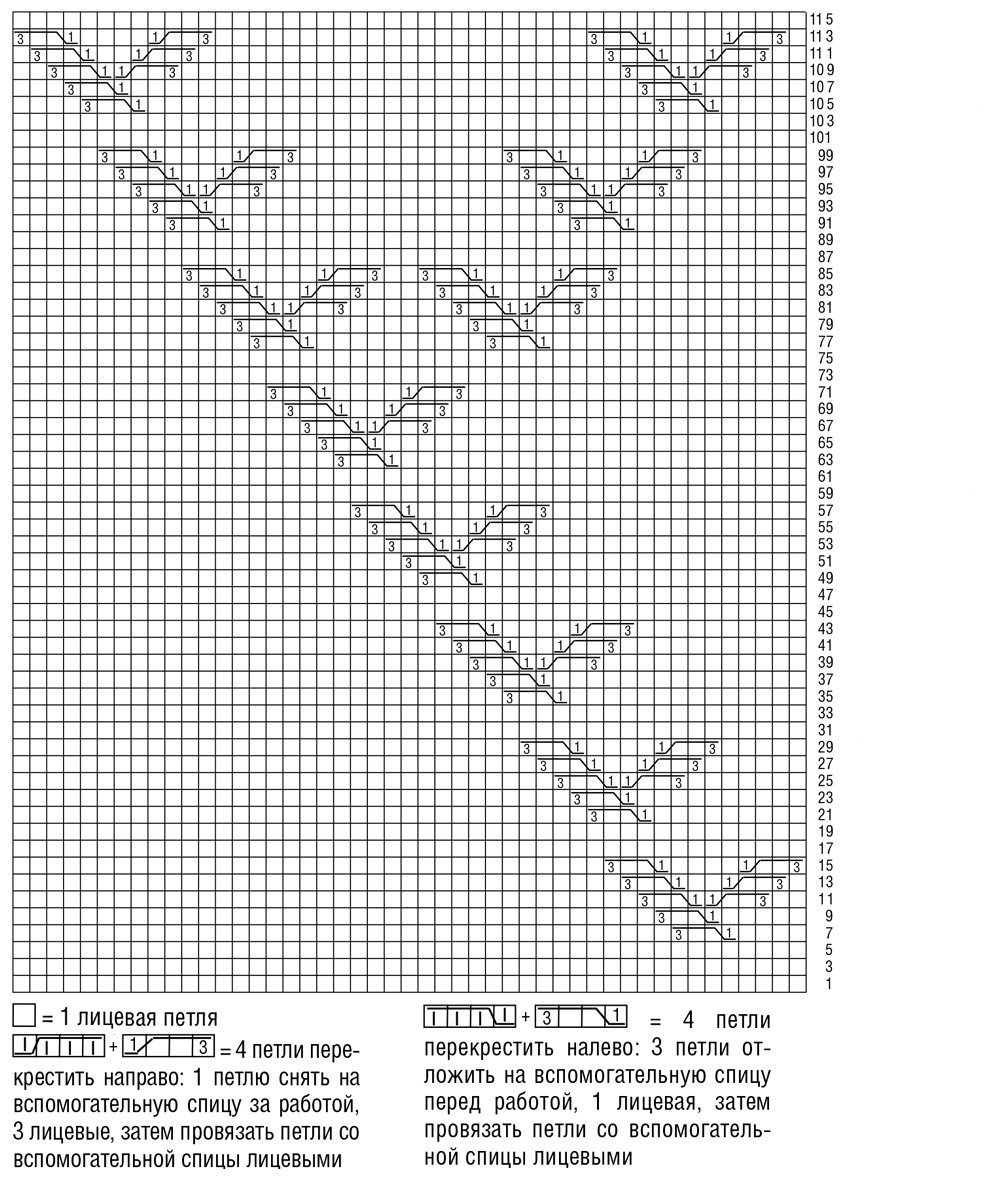 Вязать (спицы №5) = вязать по схеме. На схеме даны только лицевые ряды. В изнаночных рядах все петли вязать изнаночными. В высоту 1 раз провязать 1–116-й ряды, затем закончить лицевой гладью.
