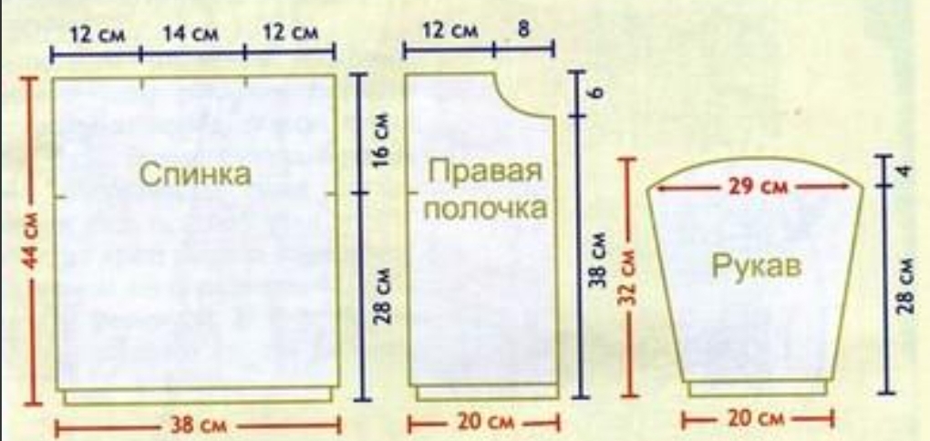 3 п., 2 п. и 1 п. На общей высоте 44 см закрыть 24 п. для плеча и закончить вязание.