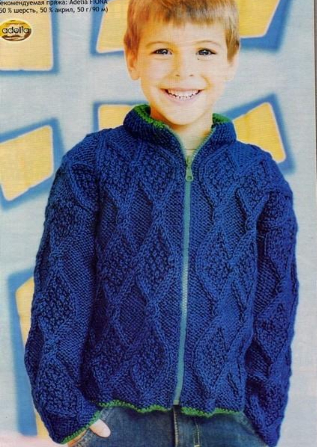 480 г полушерстяной пряжи средней толщины синего цвета и 20 г пряжи зеленого цвета,разъемная застежка-молниядлиной 40 см.