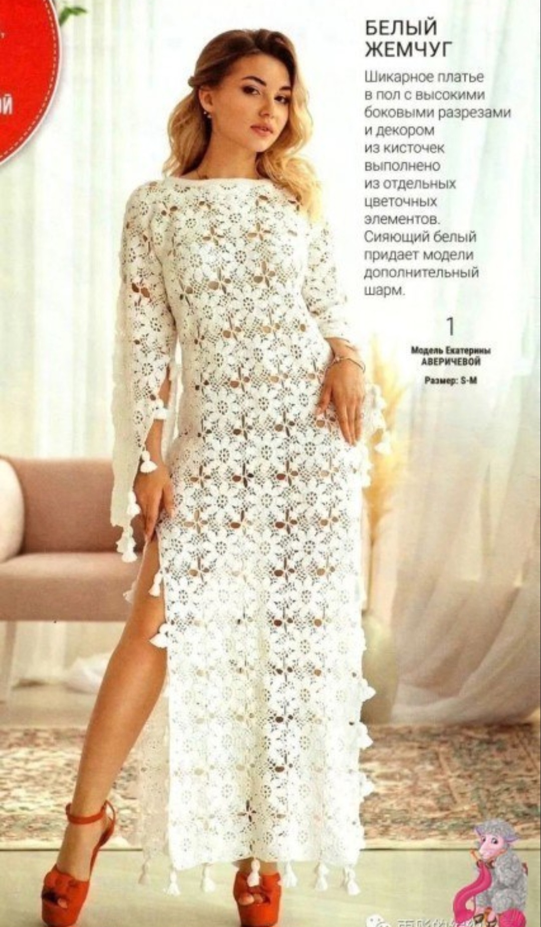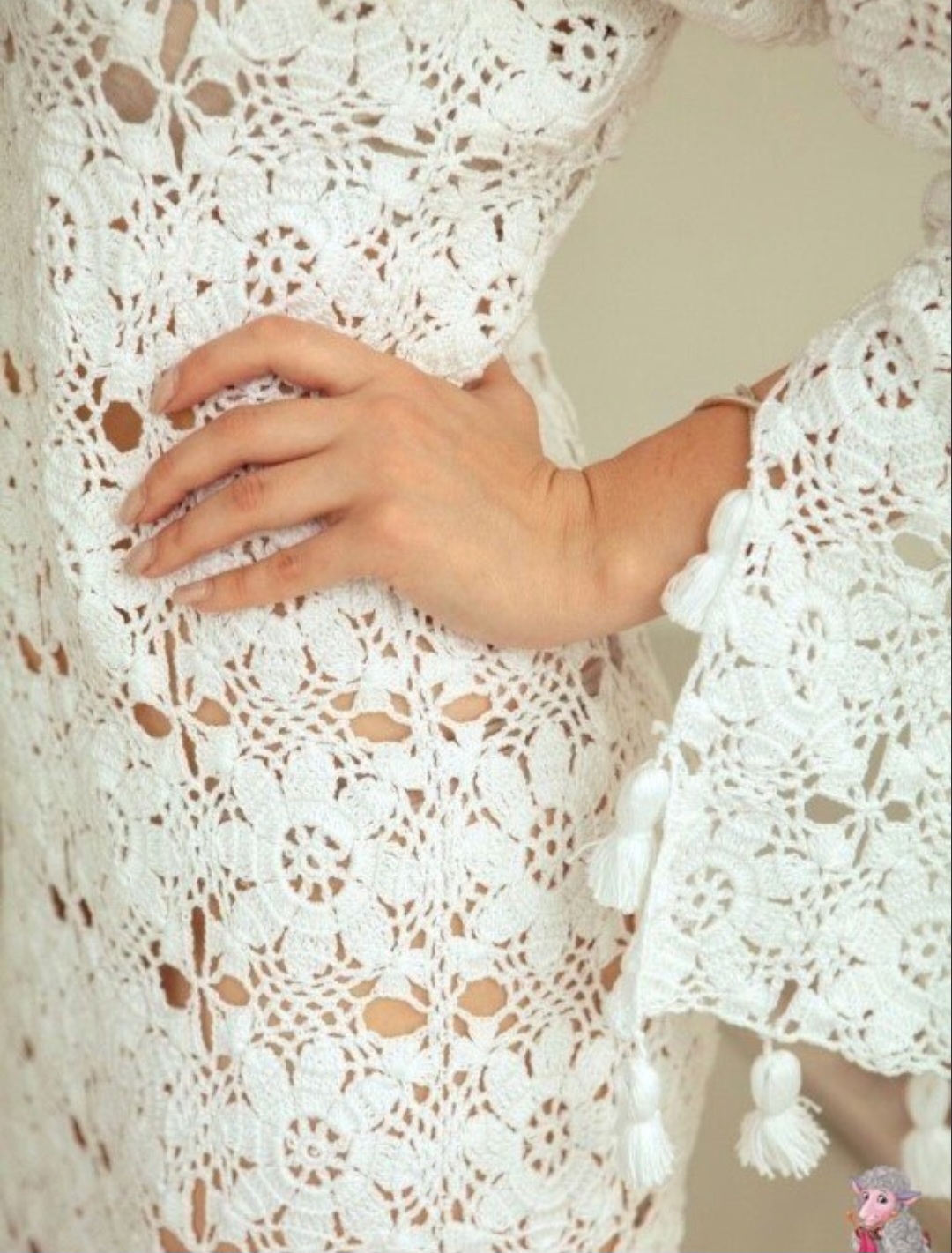 Восхитительное кружевное платье, созданное крючком, поражает своей изящностью. Узор напоминает цветочные мотивы, а декоративные кисточки на рукавах добавляют игривости и легкости.