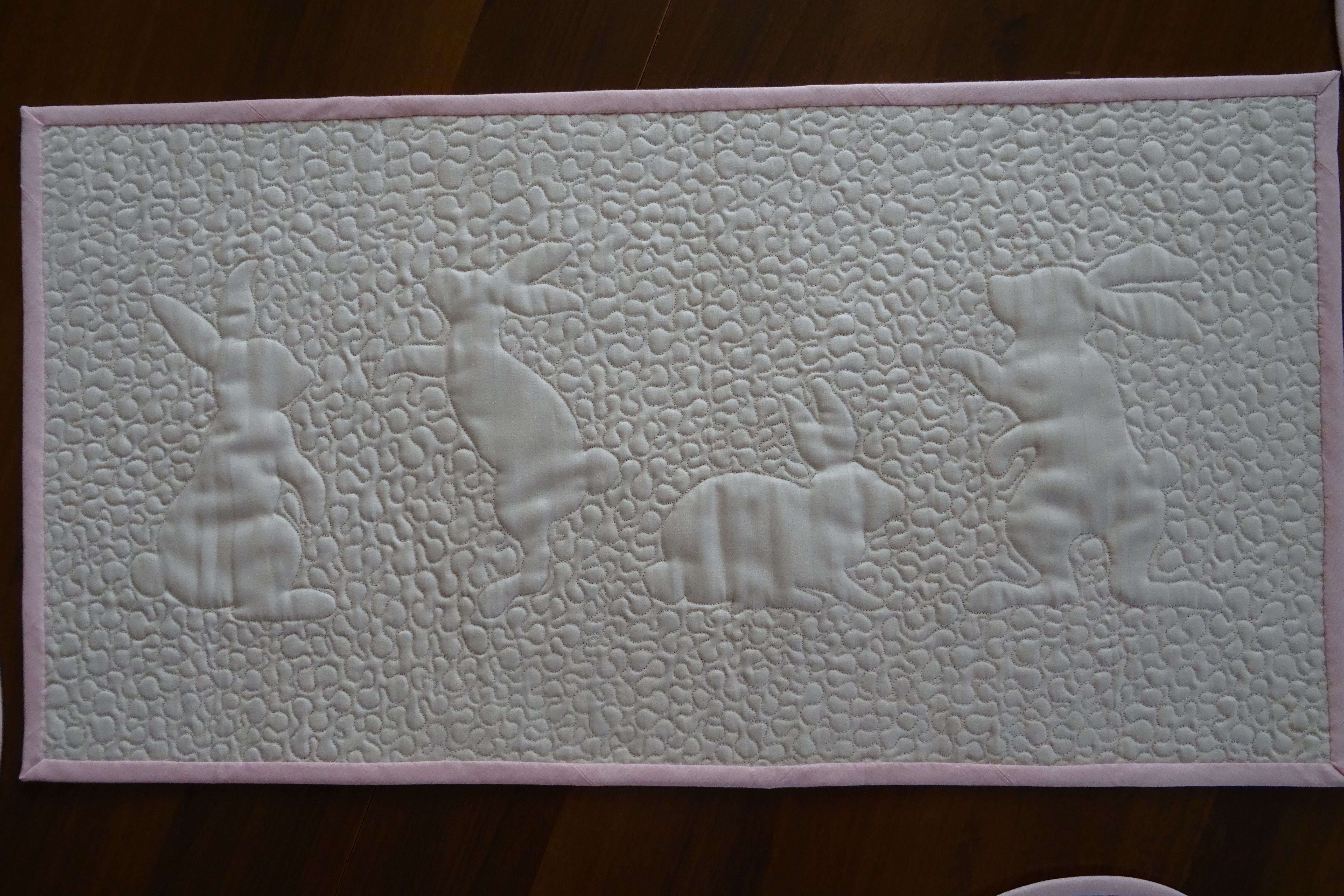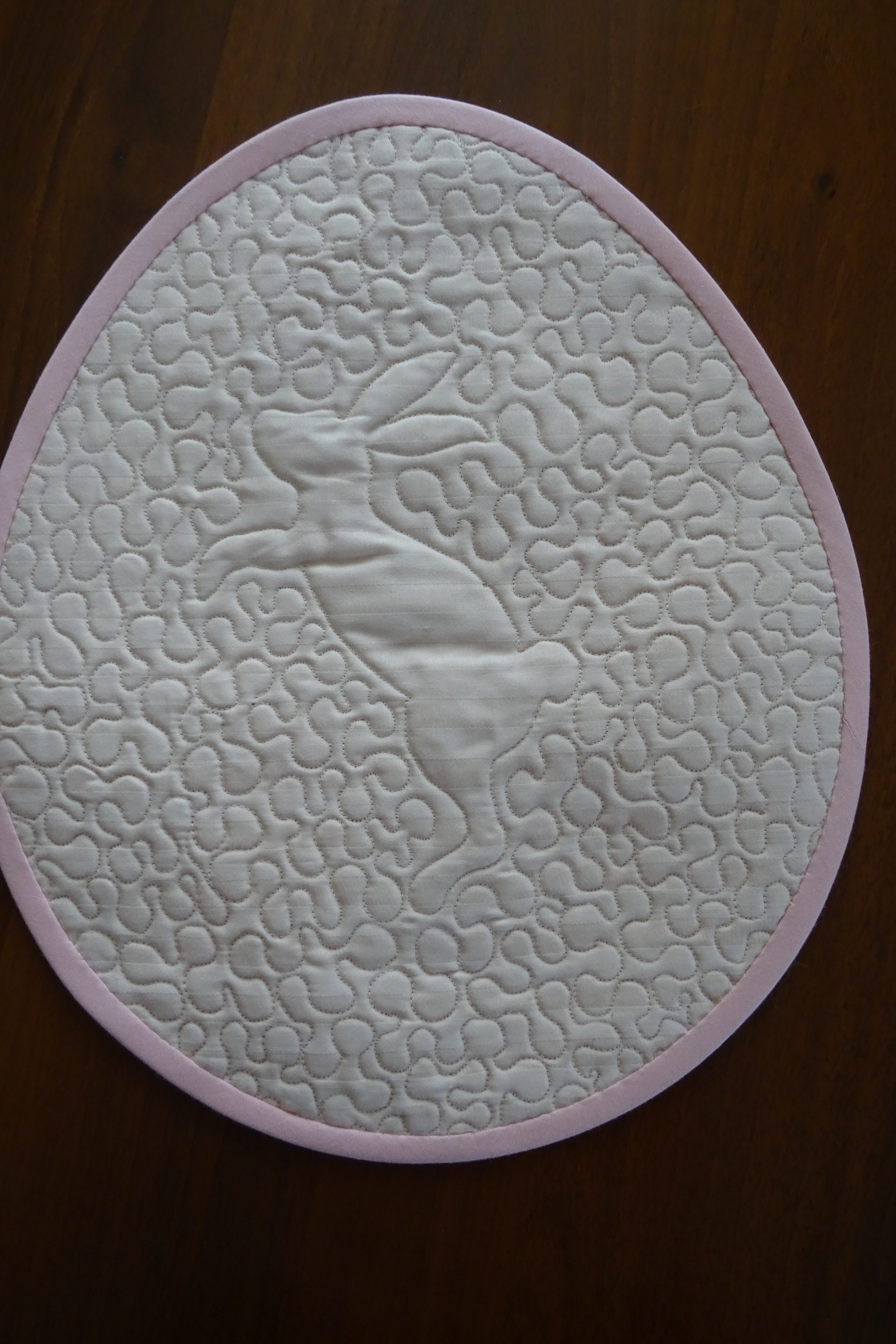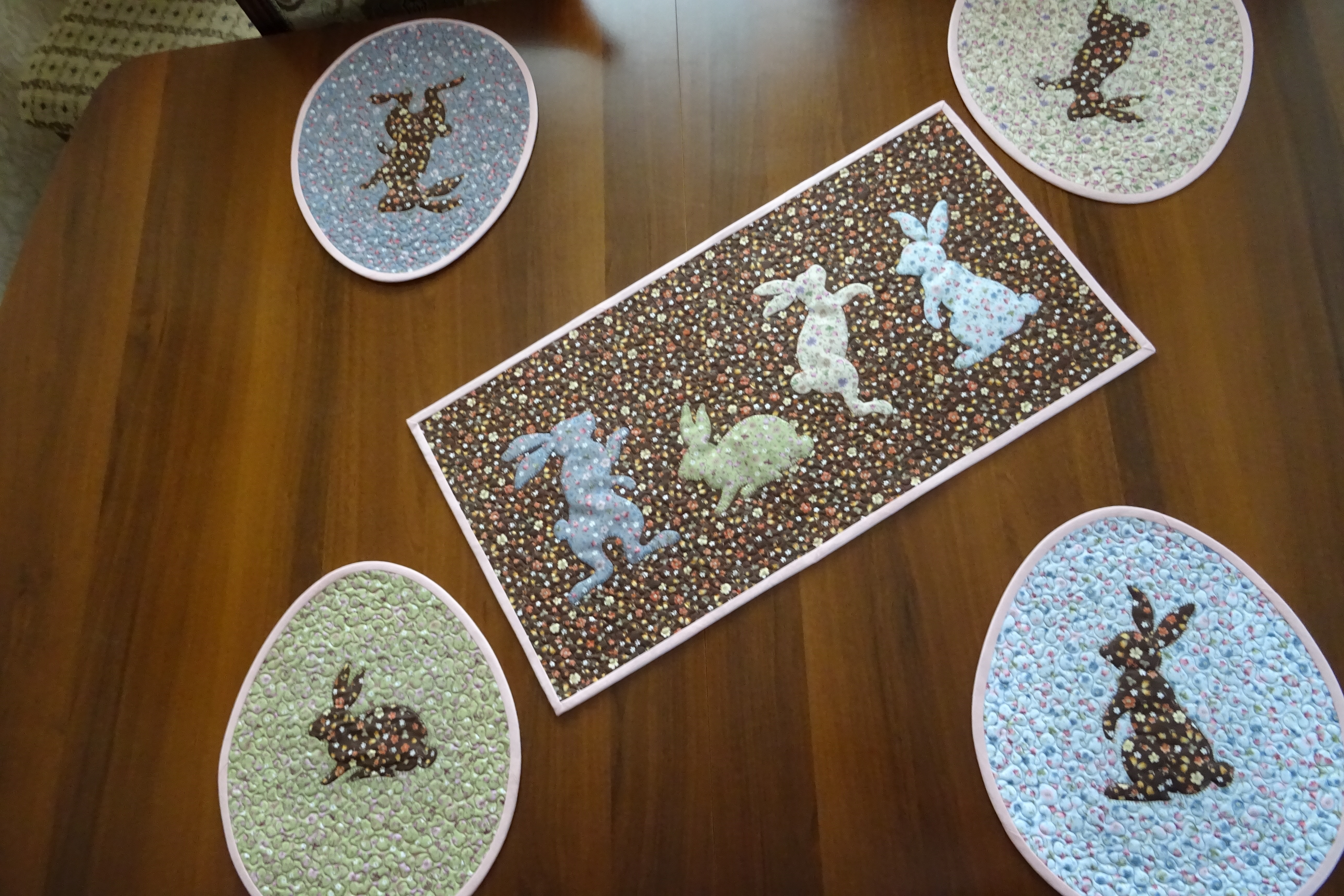 Сегодня хочу вам показать комплект "Весёлые зайцы", который сшила к Светлому празднику Пасхи. Это сервировочная салфетка и четыре ланчмата в виде яйца. Комплект шила по эскизу Ю.Доценко.