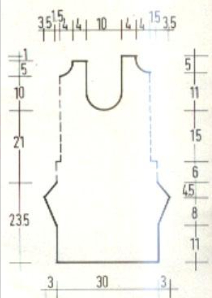 Выполнение: набрать 74 п. и вязать основным узором. На вые. 9 см — 32 р. закрыть с обеих сторон по 24 п. и вязать дальше только средние 26 п. Закрывать с двух сторон в каждом 8 р. 3 х ,1 п. Остальные 20 п. закрыть на высоте 17,5 см = 60 р.