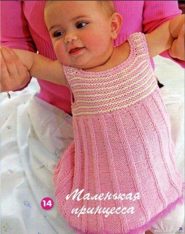 Резинка: 2 лиц., 8 изн. / 2 лиц., 7 изн. / 2 лиц., 6 изн. / 2 лиц., 5 изн. / 2 лиц., 4 изн. Платочная вязка: лиц. и изн. р. — лиц. п. Полосатый узор, платочная вязка: *2 р. белой, 2 р. розовой нитью, повторять от *