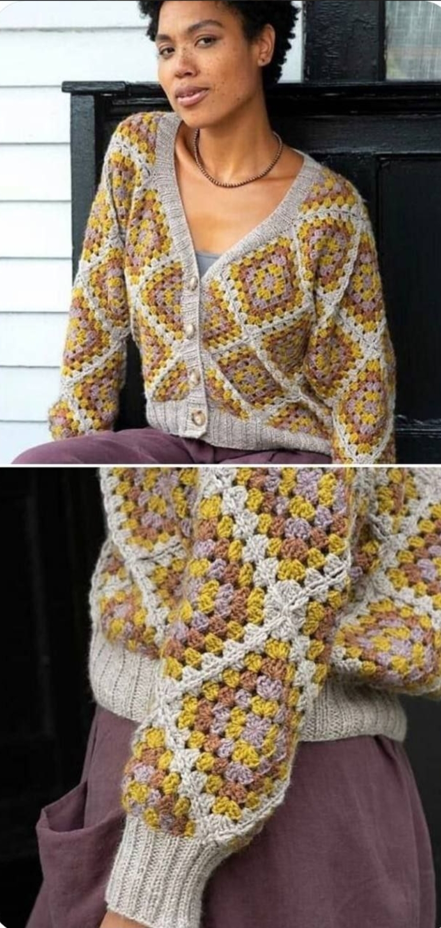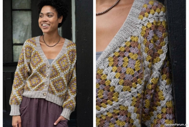 Взрыв цвета и текстур в этом уютном кардигане! Великолепная вязка крючком создает узоры из больших квадратов, где яркие горчичные и фиолетовые оттенки переплетаются с нейтральной серой основой. Элегантный V-образный вырез и аккуратные пуговицы добавляют изделию изысканности и шарма.