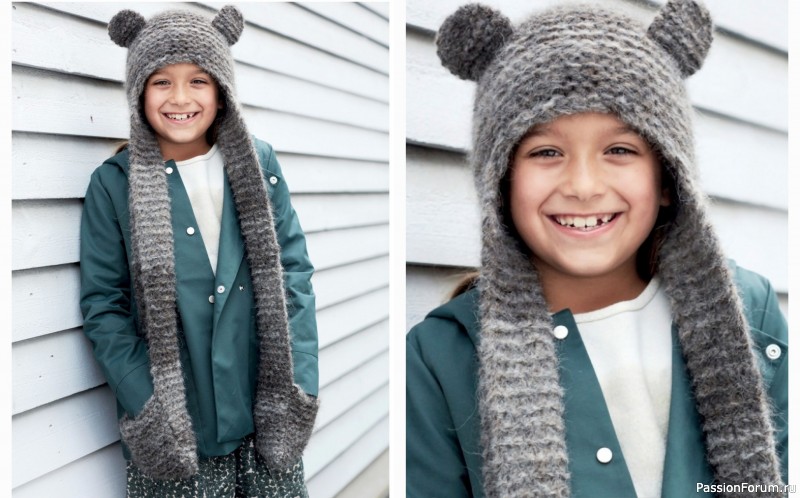Забавная шапочка объединена с шарфиком, а для тепла на краях шарфа сделаны уютные карманы.