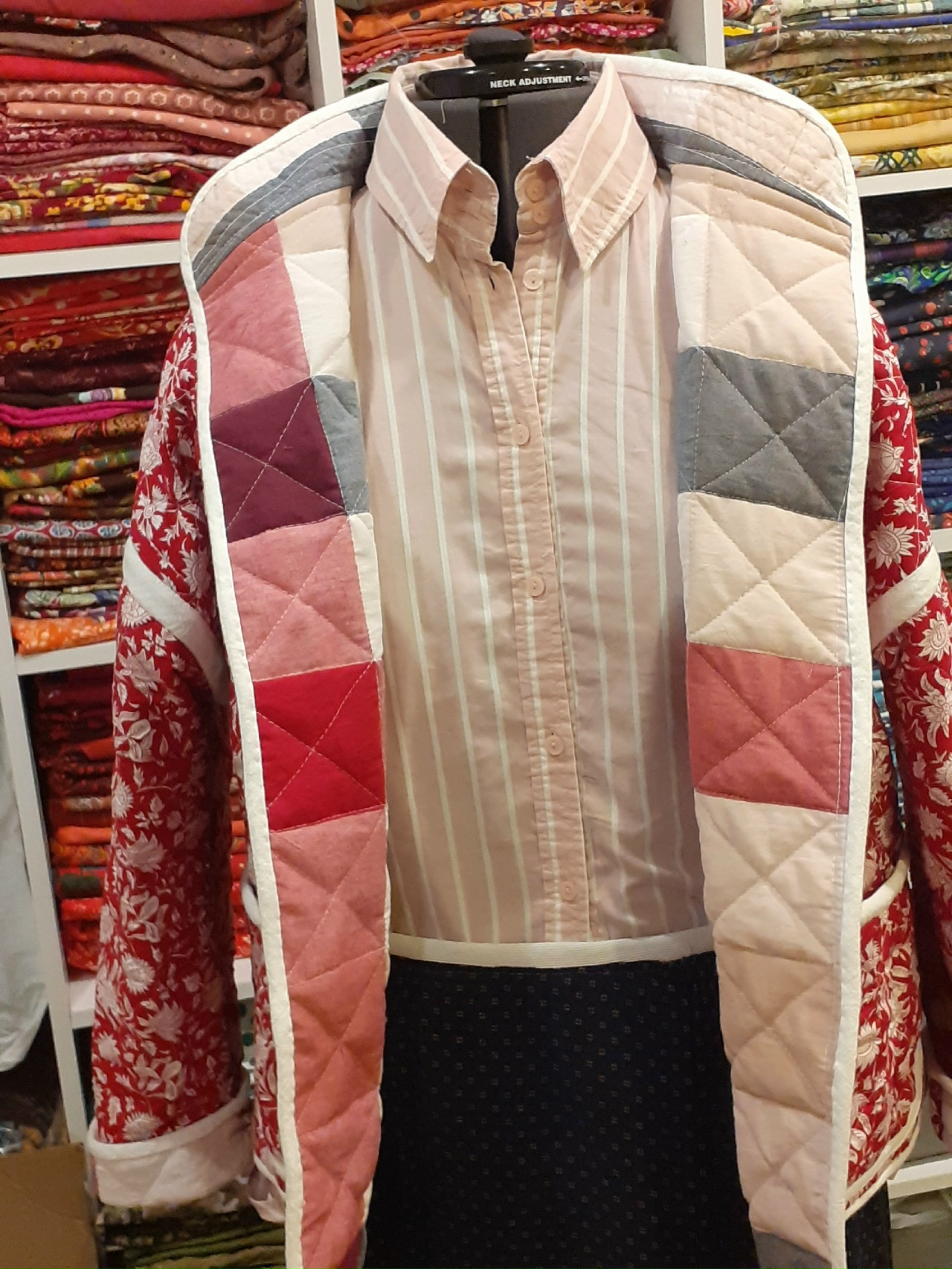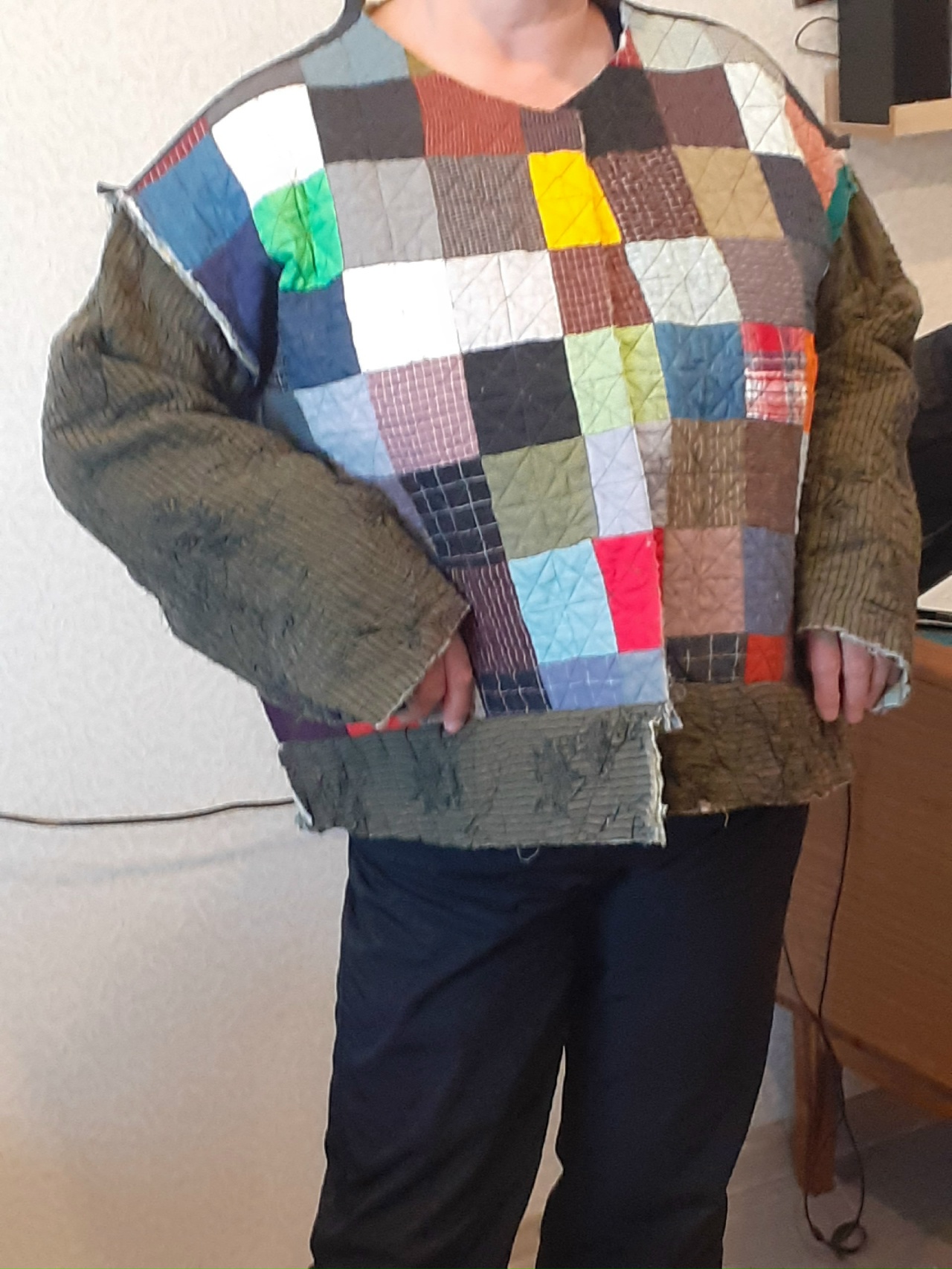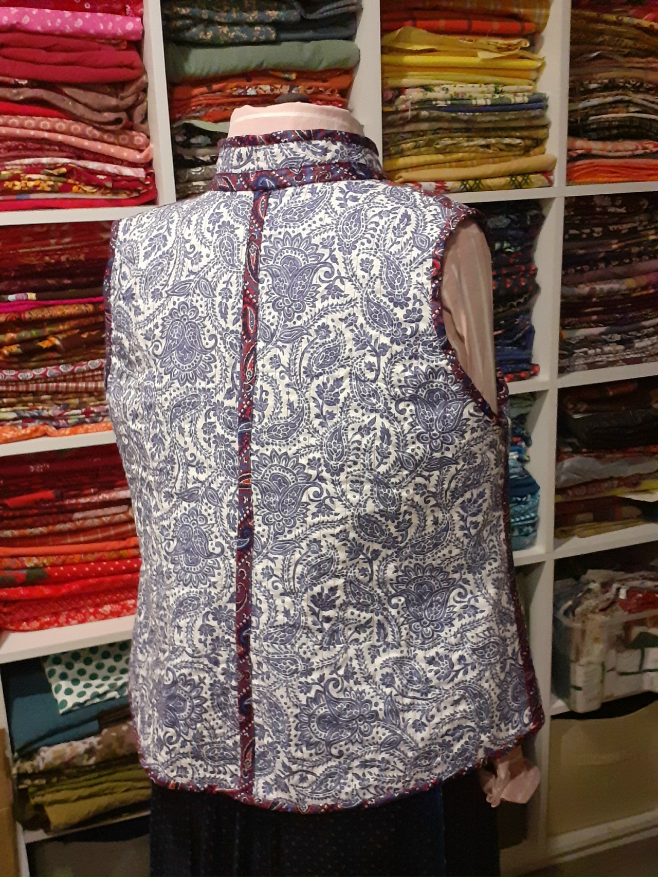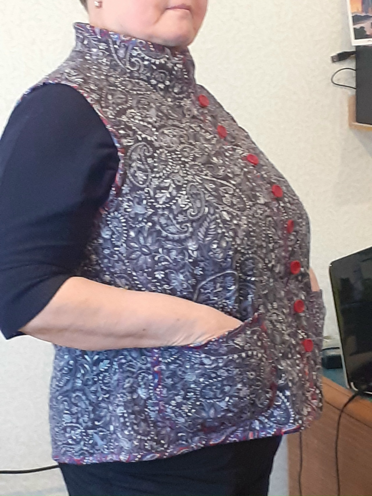 Далее жилет на нестандартную фигуру, когда бюст - 58/60, а талия 52, а бедра 50! Без утеплителя. просто простеганы две хлопковые ткани: фланель и рогожка. Надо сказать, что удачный тандем! Рекомендую для использования.
