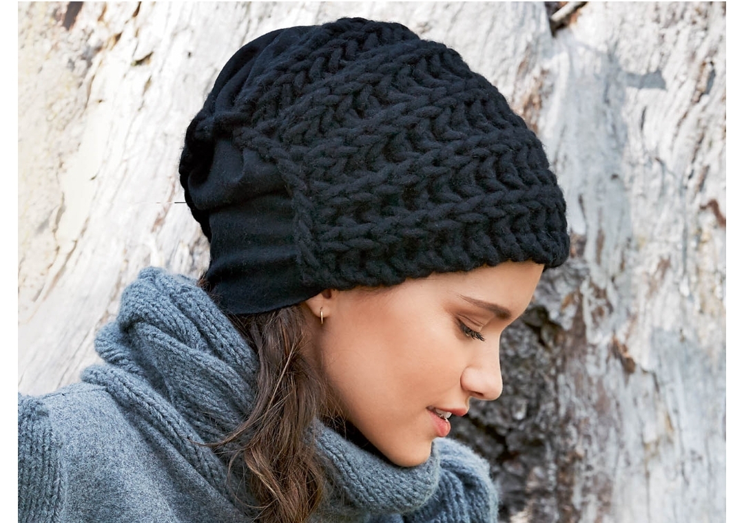 Часть этой шапки, связанной полупатентной резинкой, сделана из шерстяной ткани. Сочетание очень стильное и необычное.