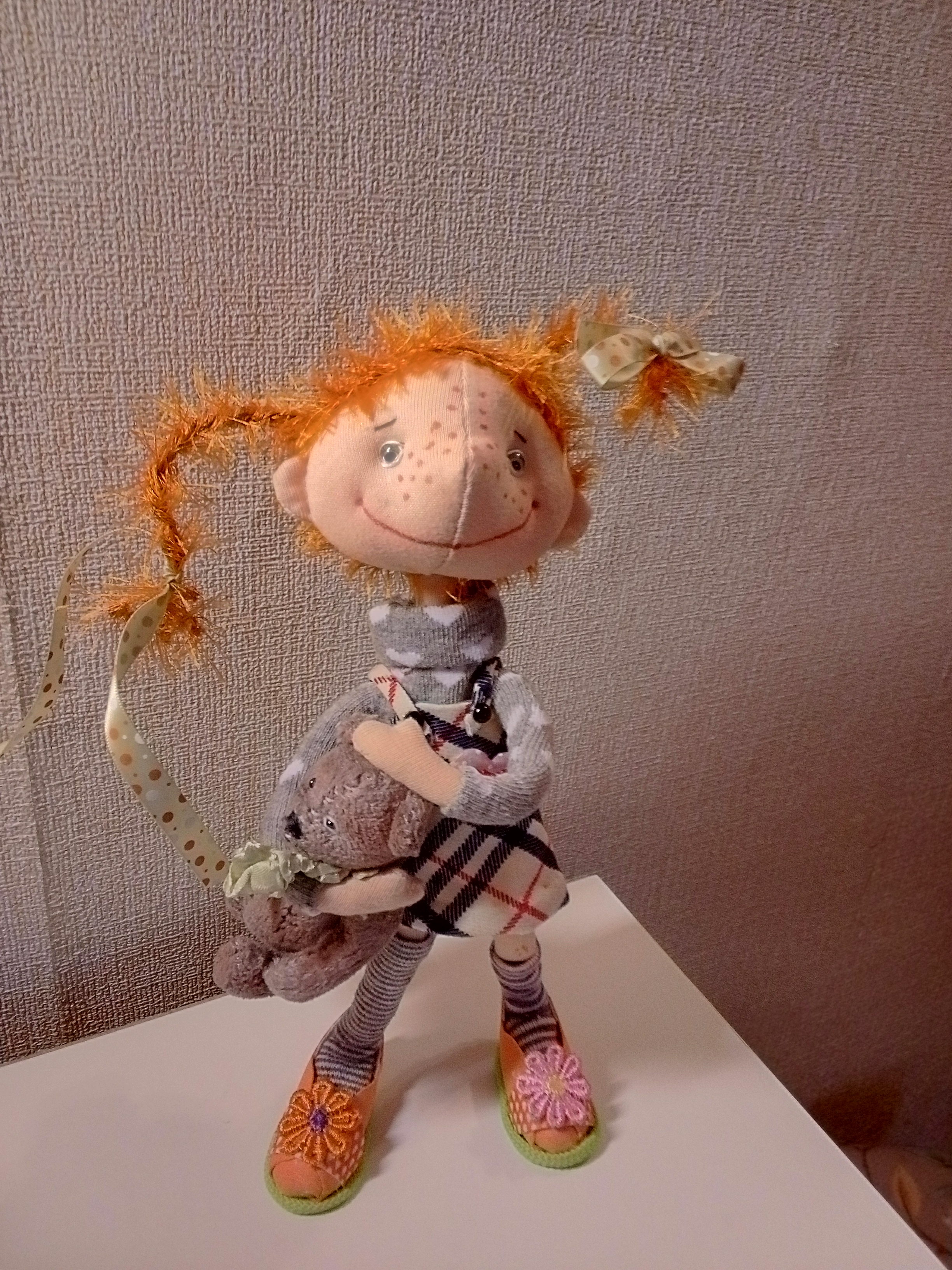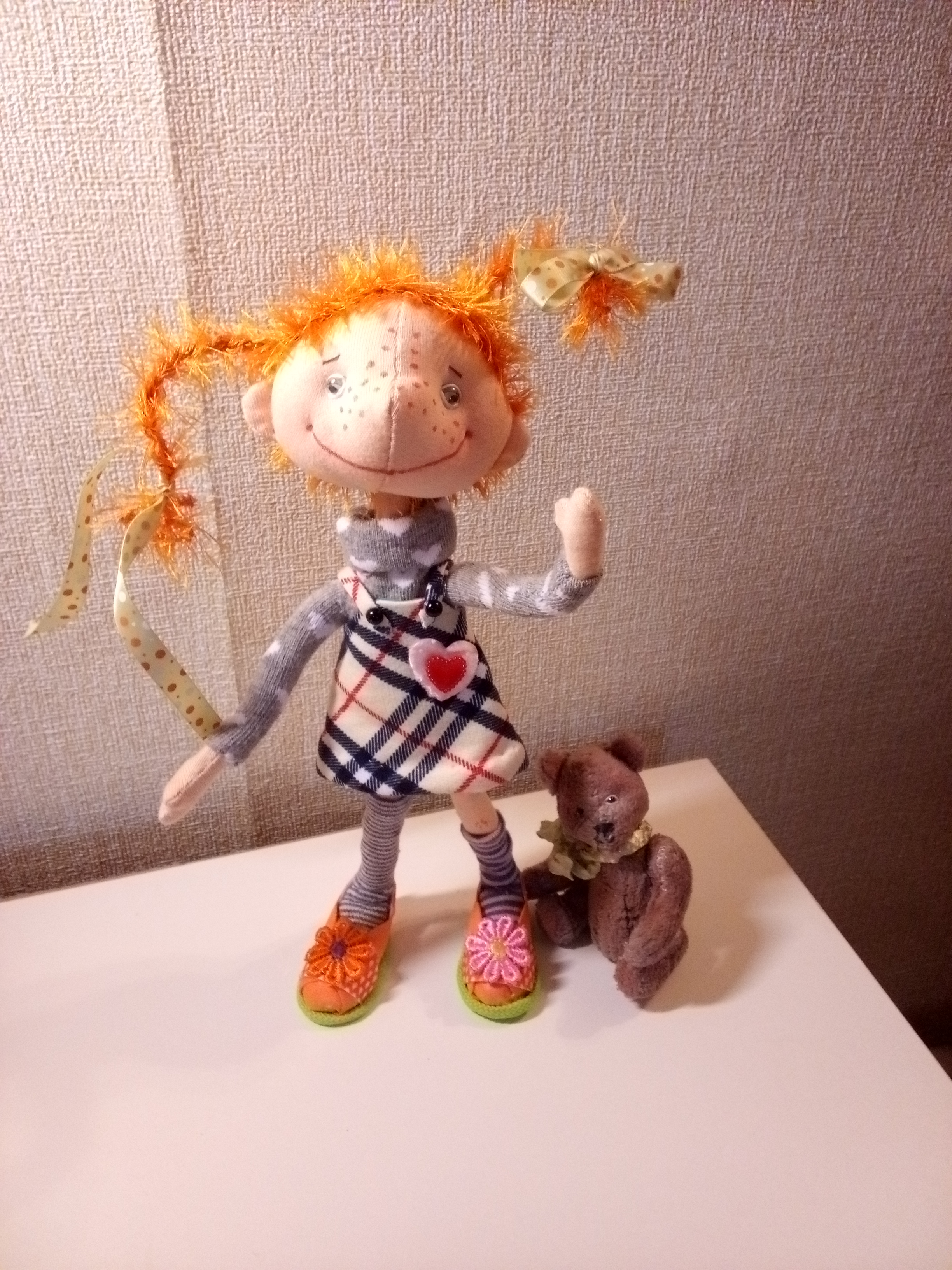 Помните эту озорную девчонку? Вот она - текстильная кукла. Вполне себе подвижная, но одежда не снимается. Пеппи вызывает улыбку у каждого, кто её видит. Создана с любовью. Причём вместе с ней идёт и её дружок медвежонок. Рост игрушки 25 см.