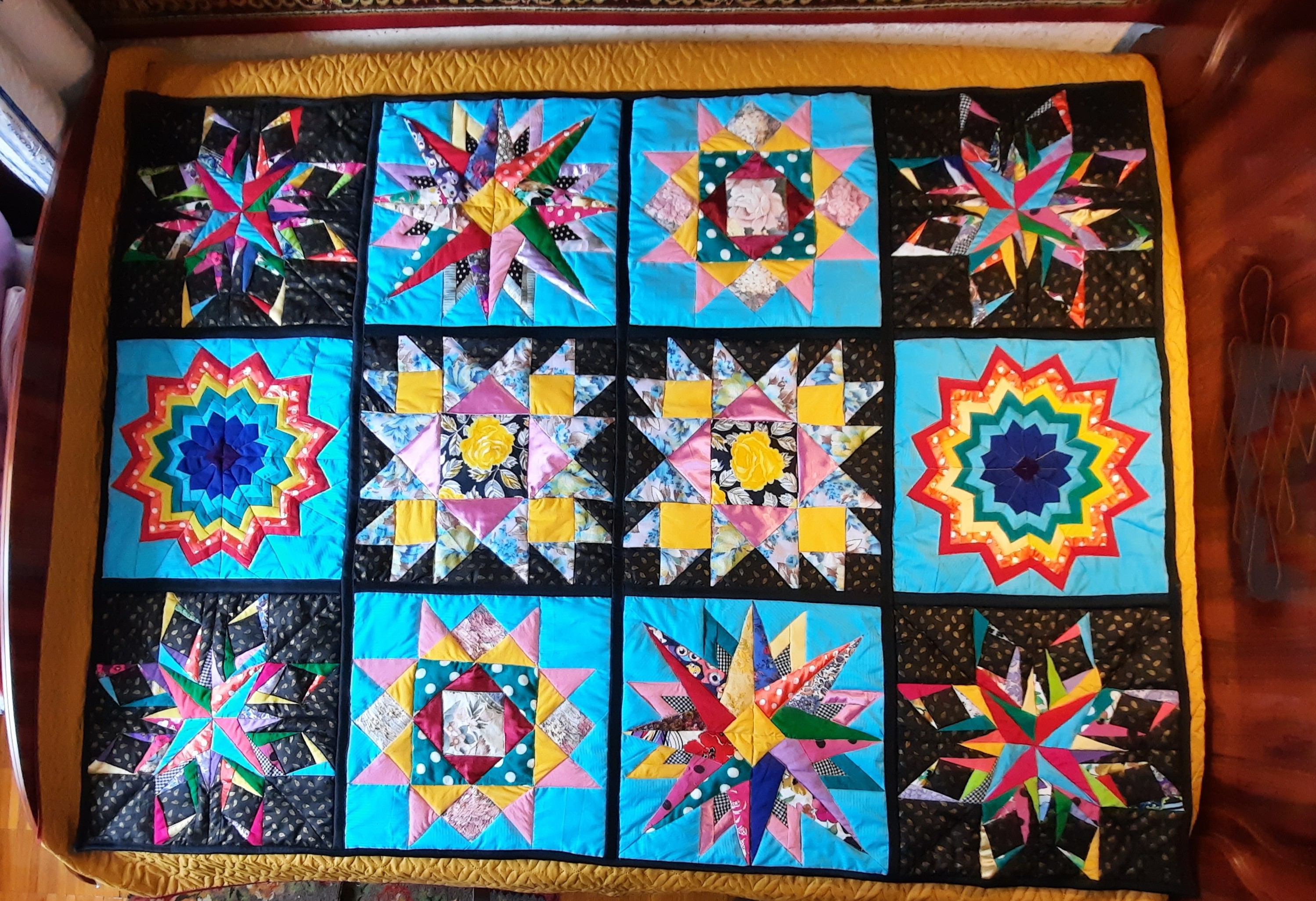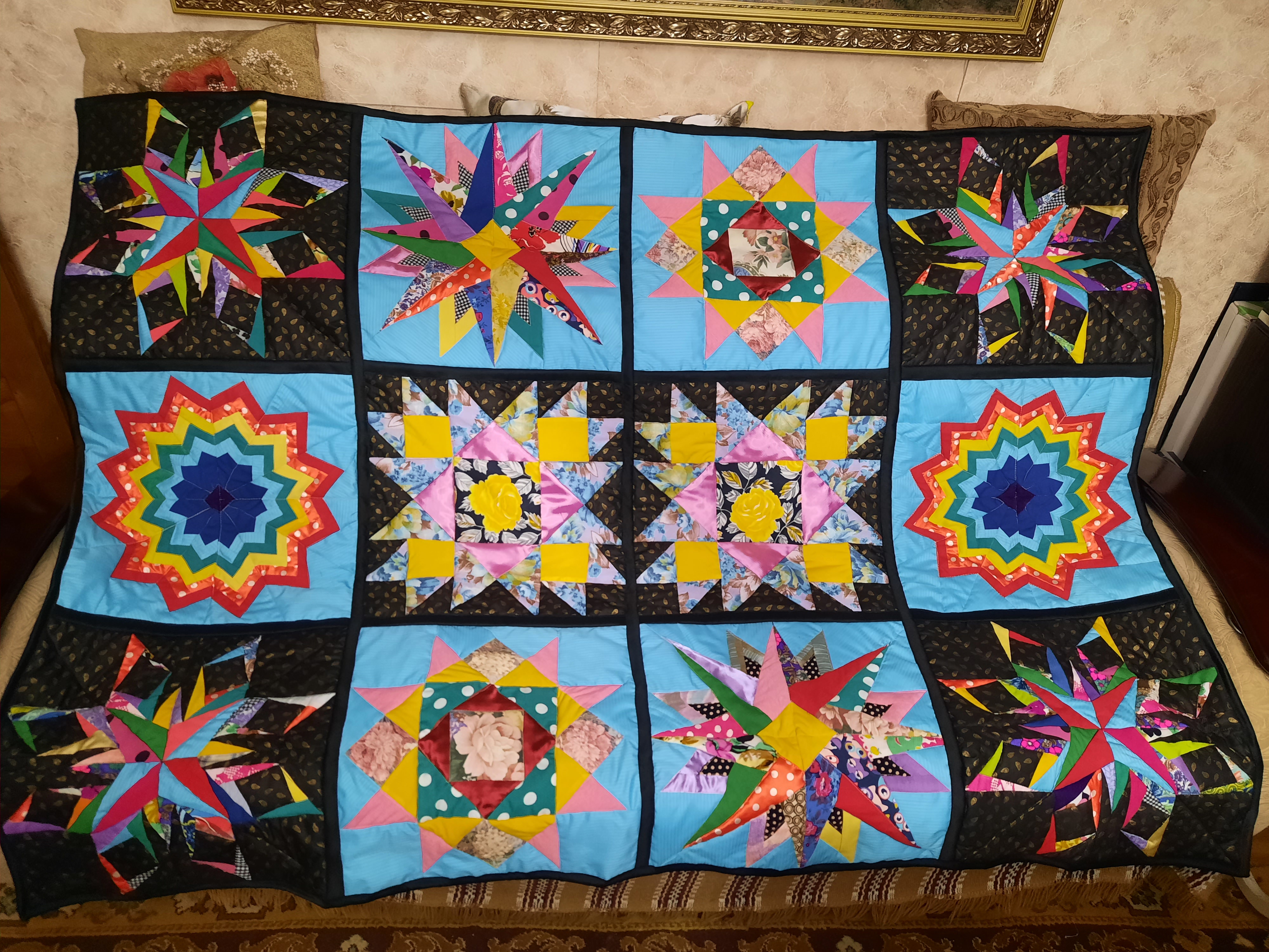 Представляю вашему вниманию законченный проект одеяла.Получилось необыкновенно яркое и красивое благодаря черному фону.Черный фон подчеркивает яркость красок.Идея родилась из Пинтерест (блок "космос") и отреза черного батиста с золотыми огурчиками,подаренного мне подругой.