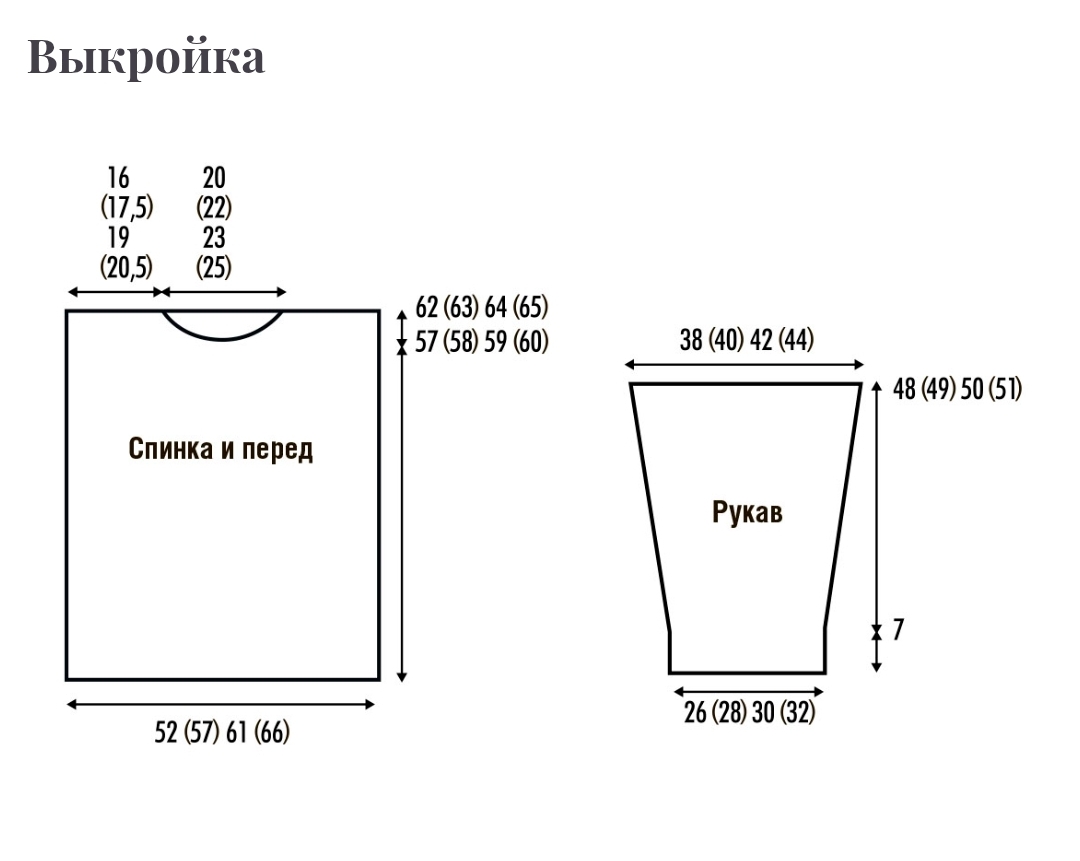 Рукава вшить в открытые проймы длиной по 19 (20) 21 (22) см, совместив середину рукава с плечевым швом.