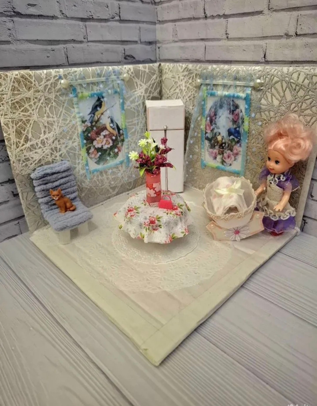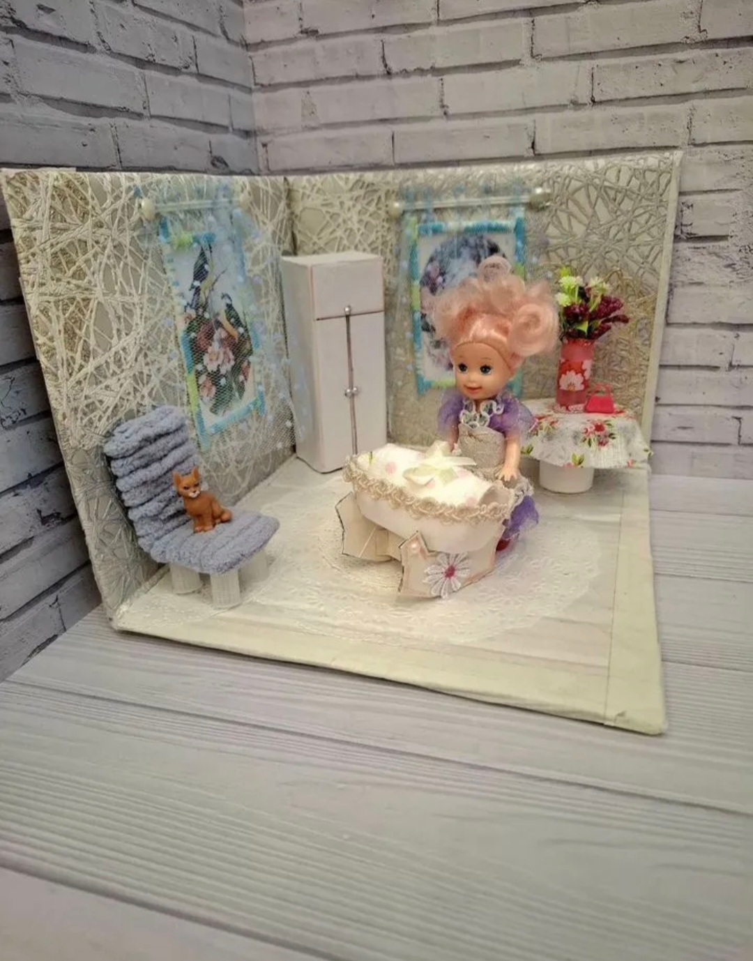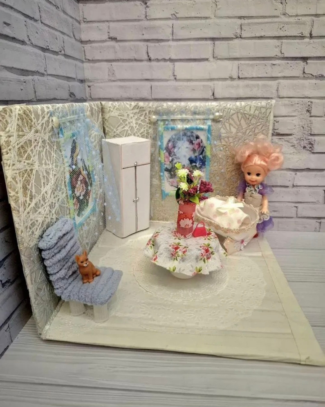 стены из календаря, кроватка из баночки от йогурта,шкаф из коробки от таблеток, стол из баночки от крема,стул из втулки от бумаги ,обмотан нитками для вязания.В окна вклеила картинки, закрыла их тюлью. Кошечка из киндера