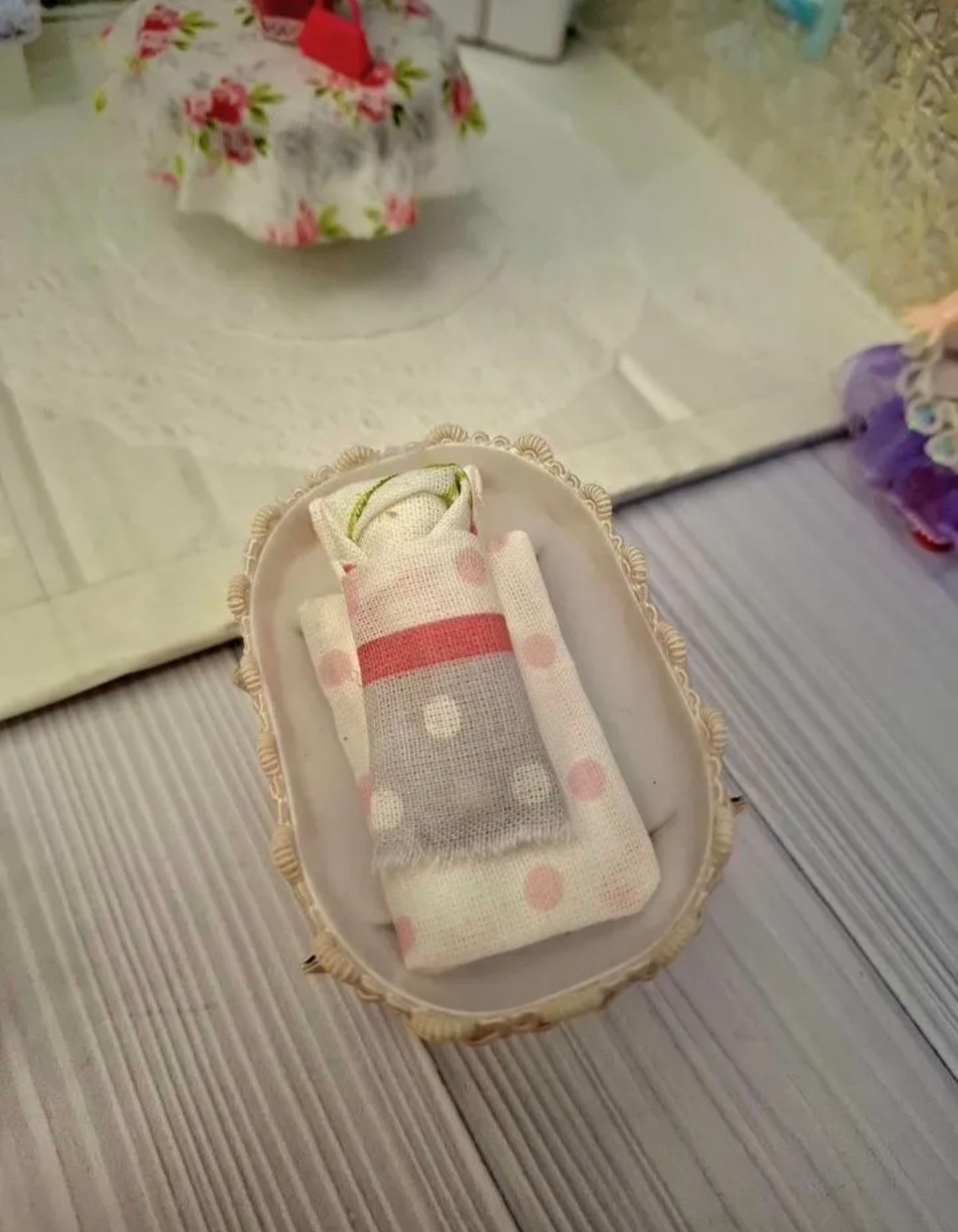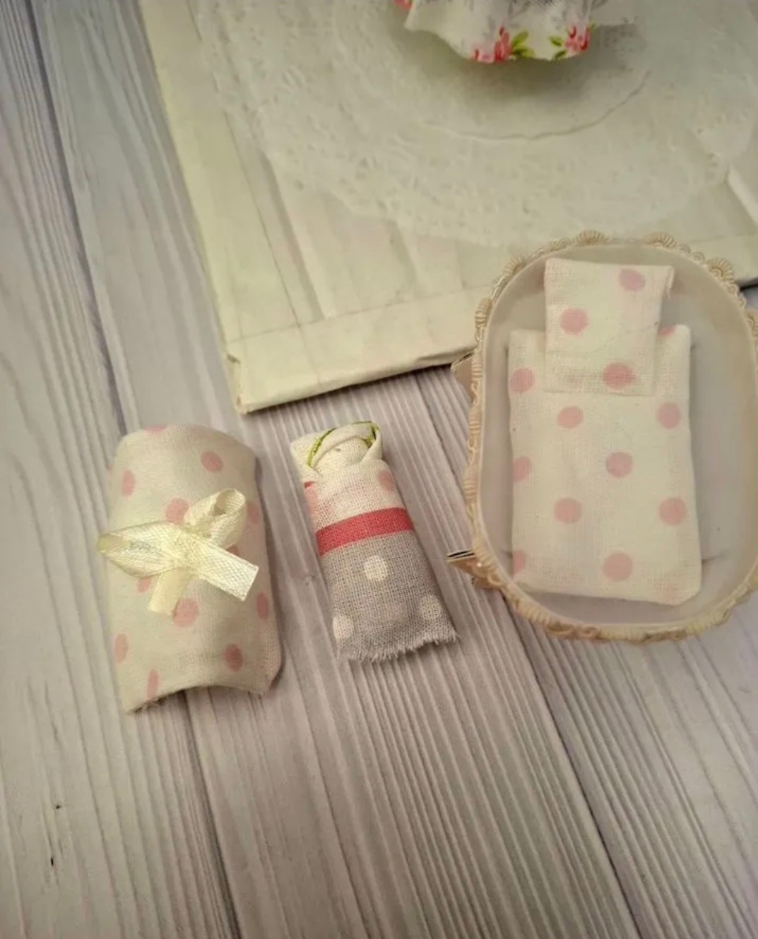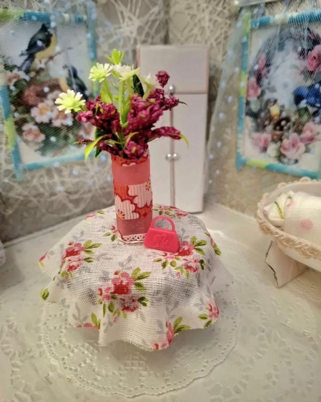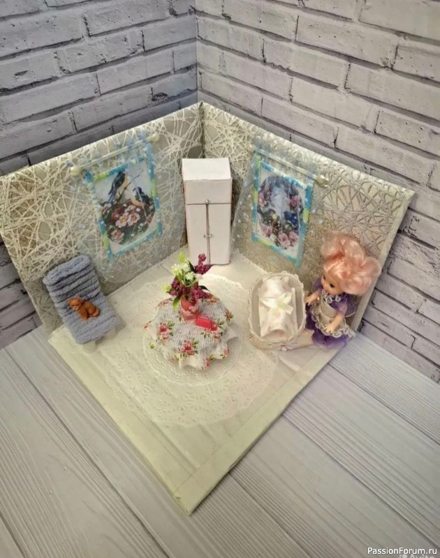 стены из календаря, кроватка из баночки от йогурта,шкаф из коробки от таблеток, стол из баночки от крема,стул из втулки от бумаги ,обмотан нитками для вязания.В окна вклеила картинки, закрыла их тюлью. Кошечка из киндера