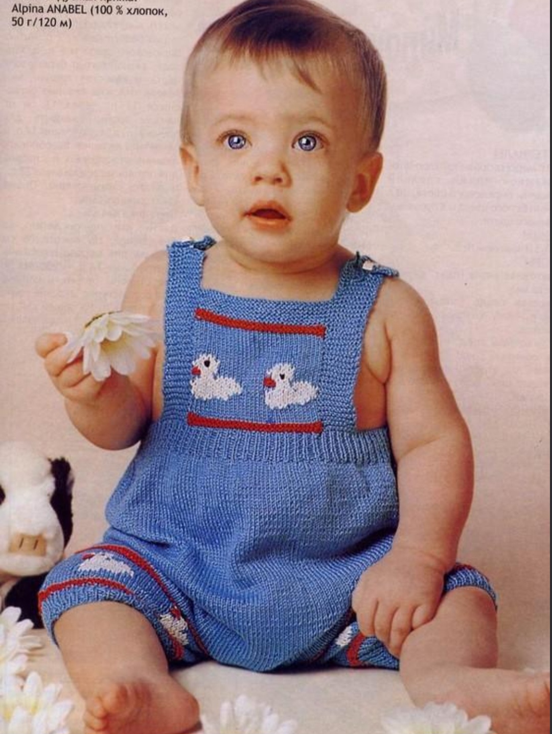 Вышить на верхней части переда 2 утенка и по 2 утенка на каждой штанине по схеме (см. фото). Выполнить боковые и шаговый швы. На бретелях задней детали выполнить по 1 отверстию для пуговиц (обметать 2 п.). На бретелях передней детали пришить пуговицы.