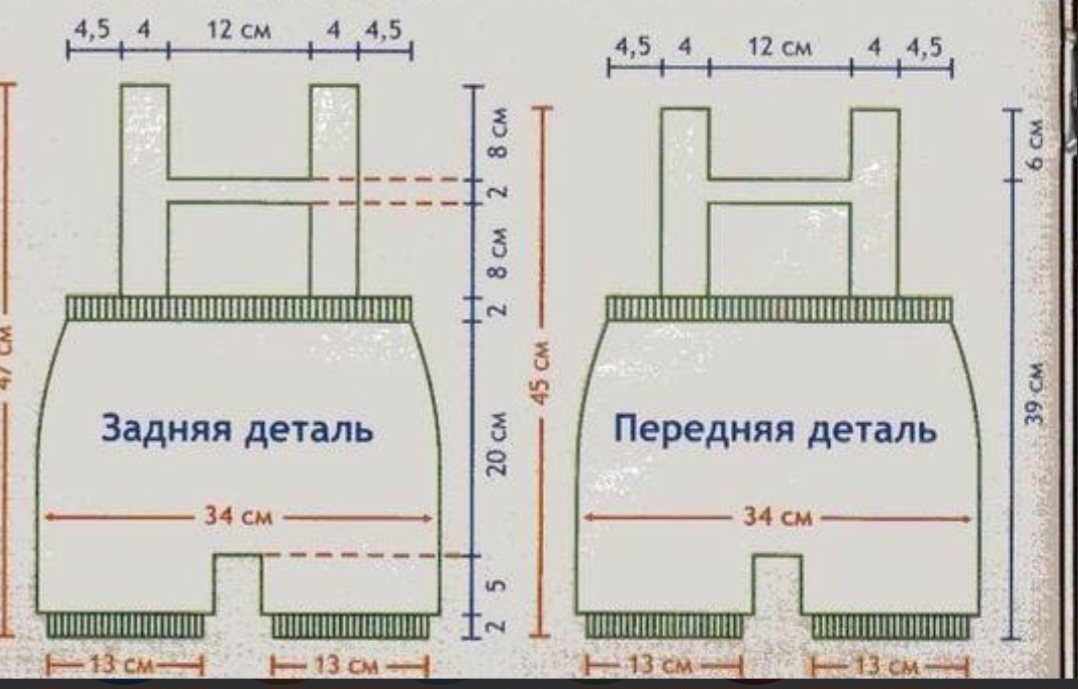п. вязать нитью красного цвета 4 р. плат, вязкой, нитью голубого цвета 24 р. лиц. гладью и нитью красного цвета 4 р. плат, вязкой. На высоте около 8 см от начала верхней части все п. вязать нитью голубого цвета плат, вязкой на протяжении 2 см. Закрыть для выреза горловины центральные 29 п. и продолжить вязание 10 п. каждой бретели нитью голубого цвета плат, вязкой раздельно. Через 8 см закрыть п. и закончить вязание. Общая высота около 47 см. Передняя деталь Вязать, как заднюю деталь. На высоте 39 см от начала вязания закрыть для выреза горловины центральные 29 п. и продолжить вязание 10 п. каждой бретели плат, вязкой раздельно. Через 6 см закрыть п. и закончить вязание. Общая высота около 45 см.