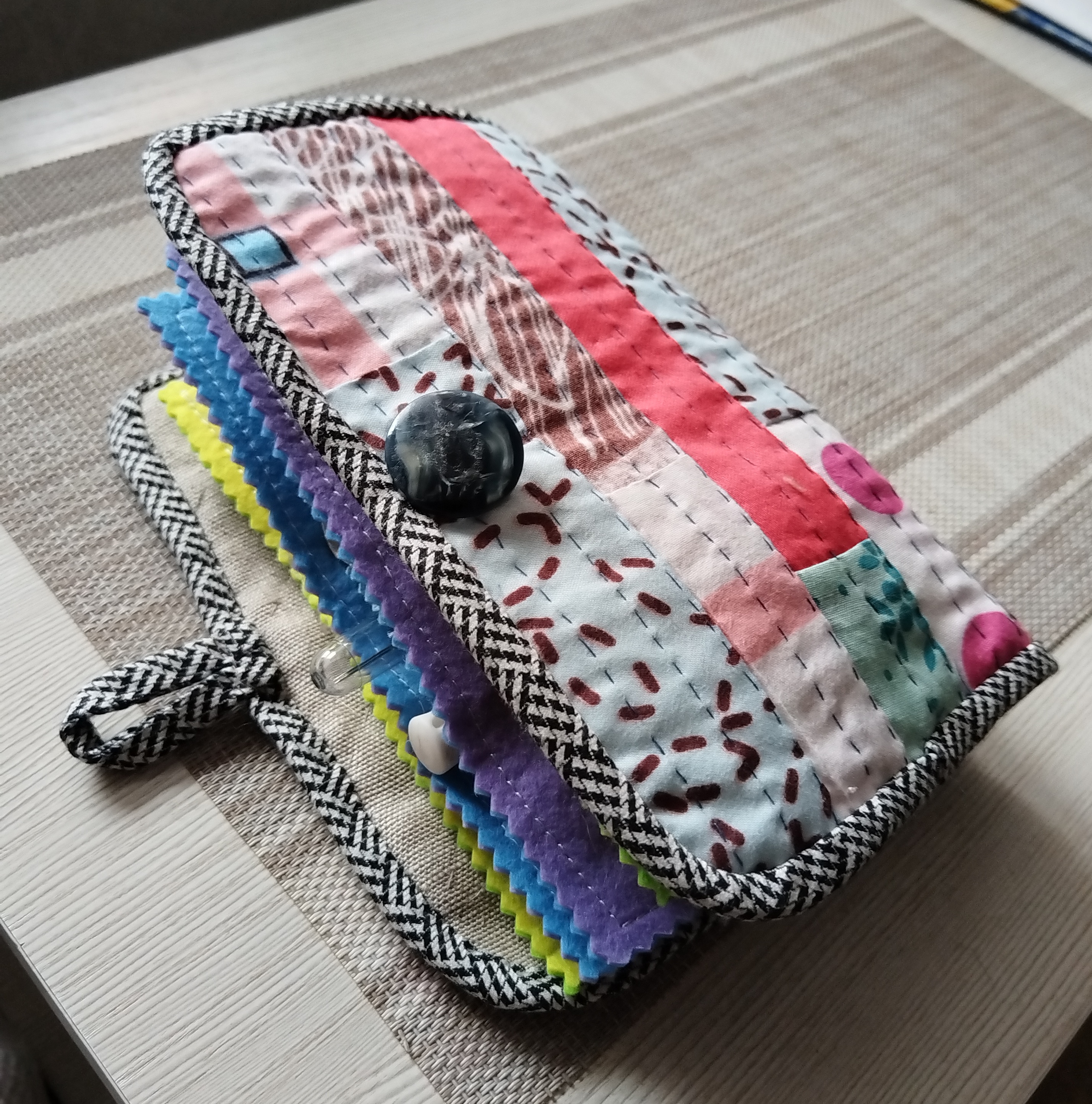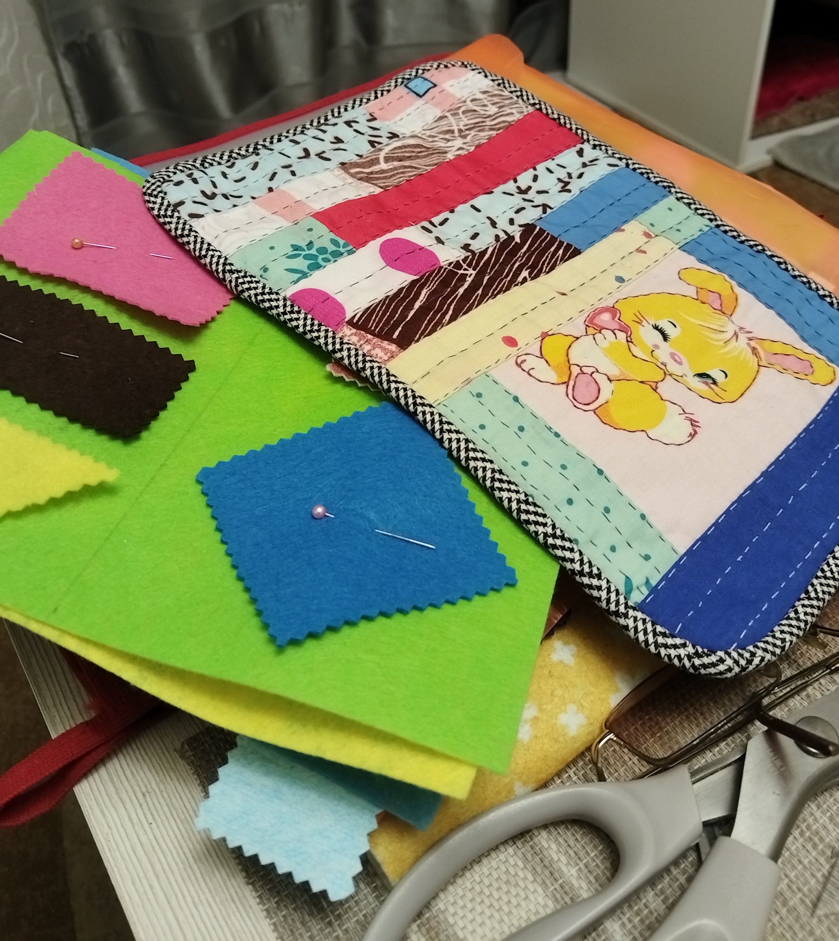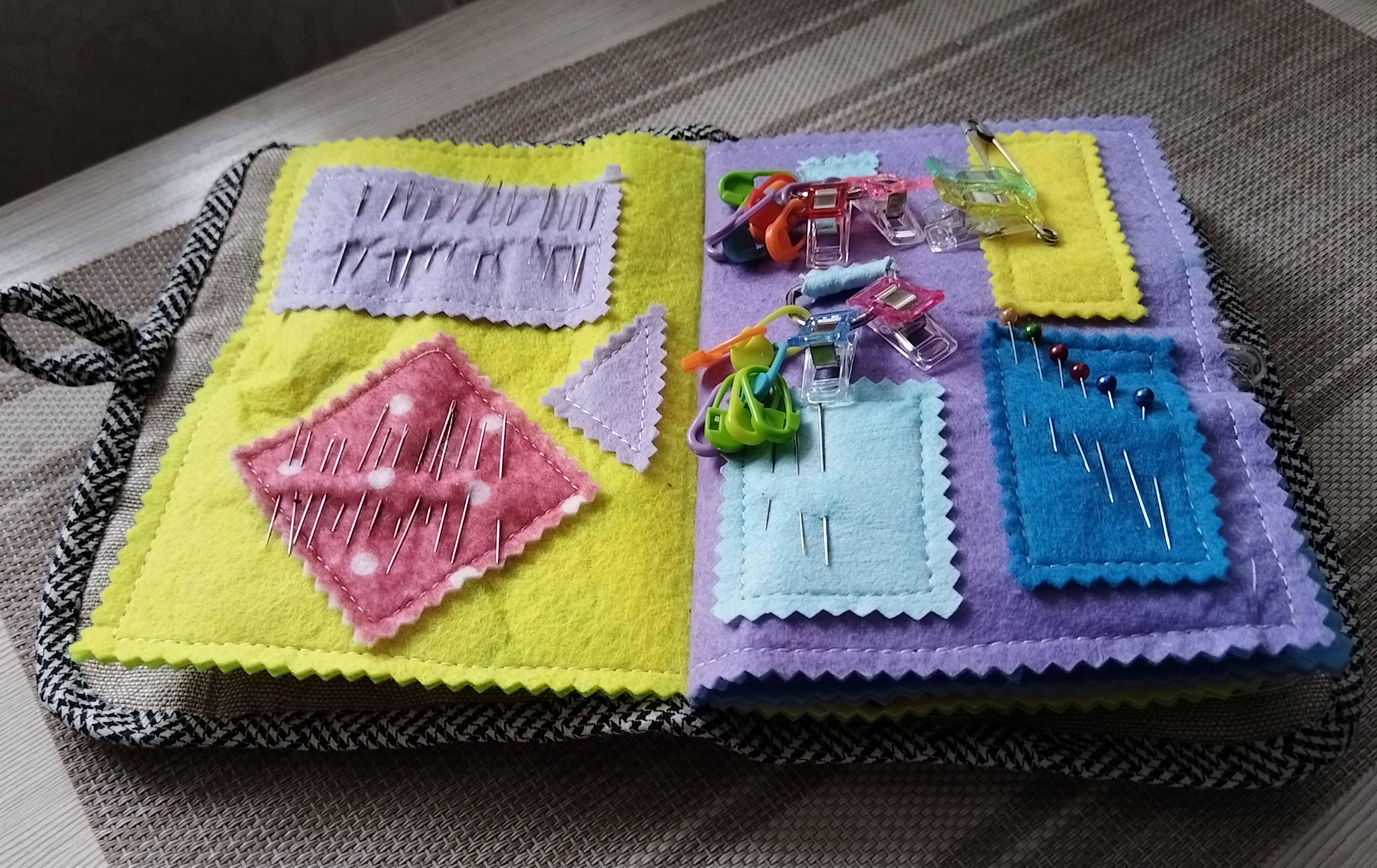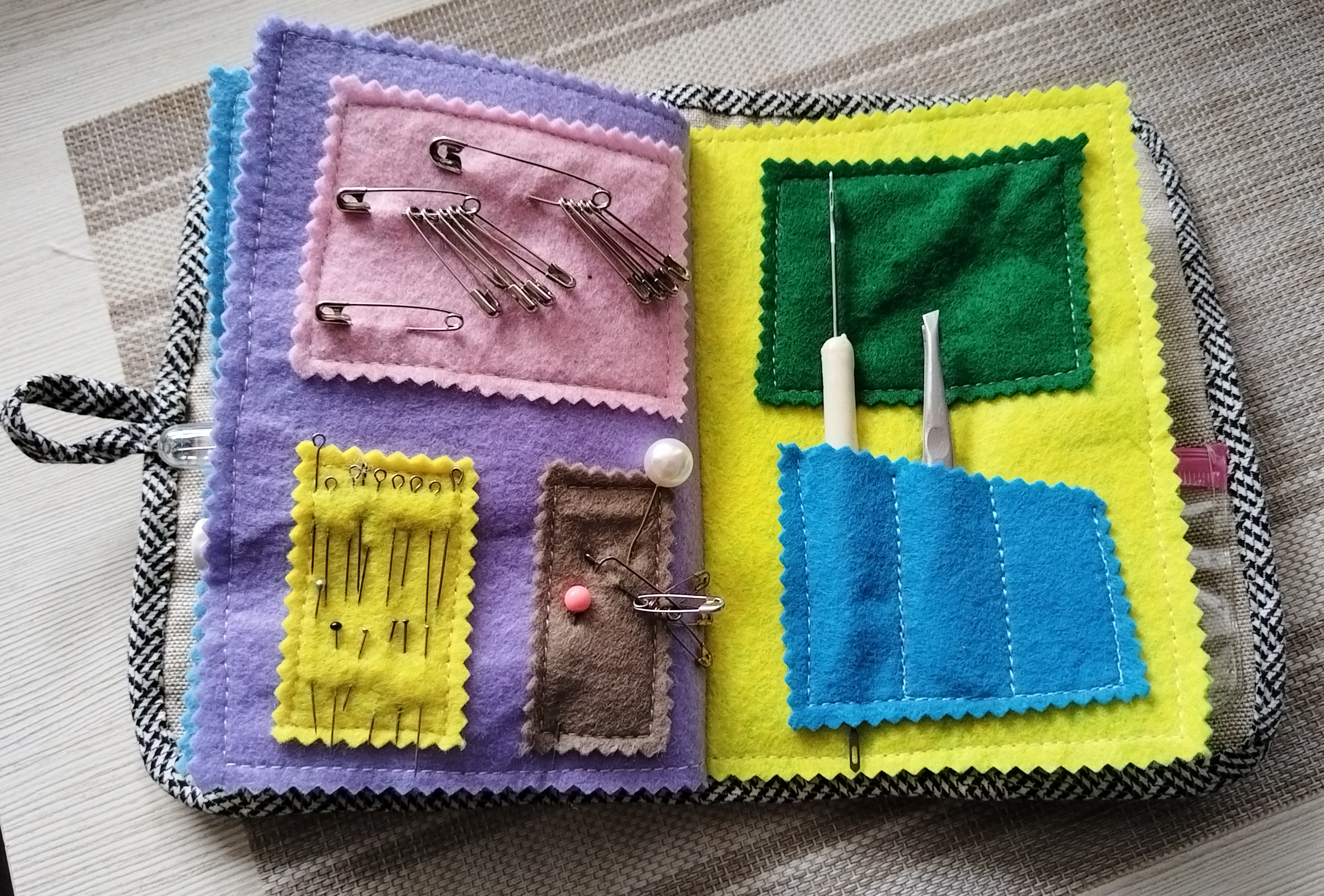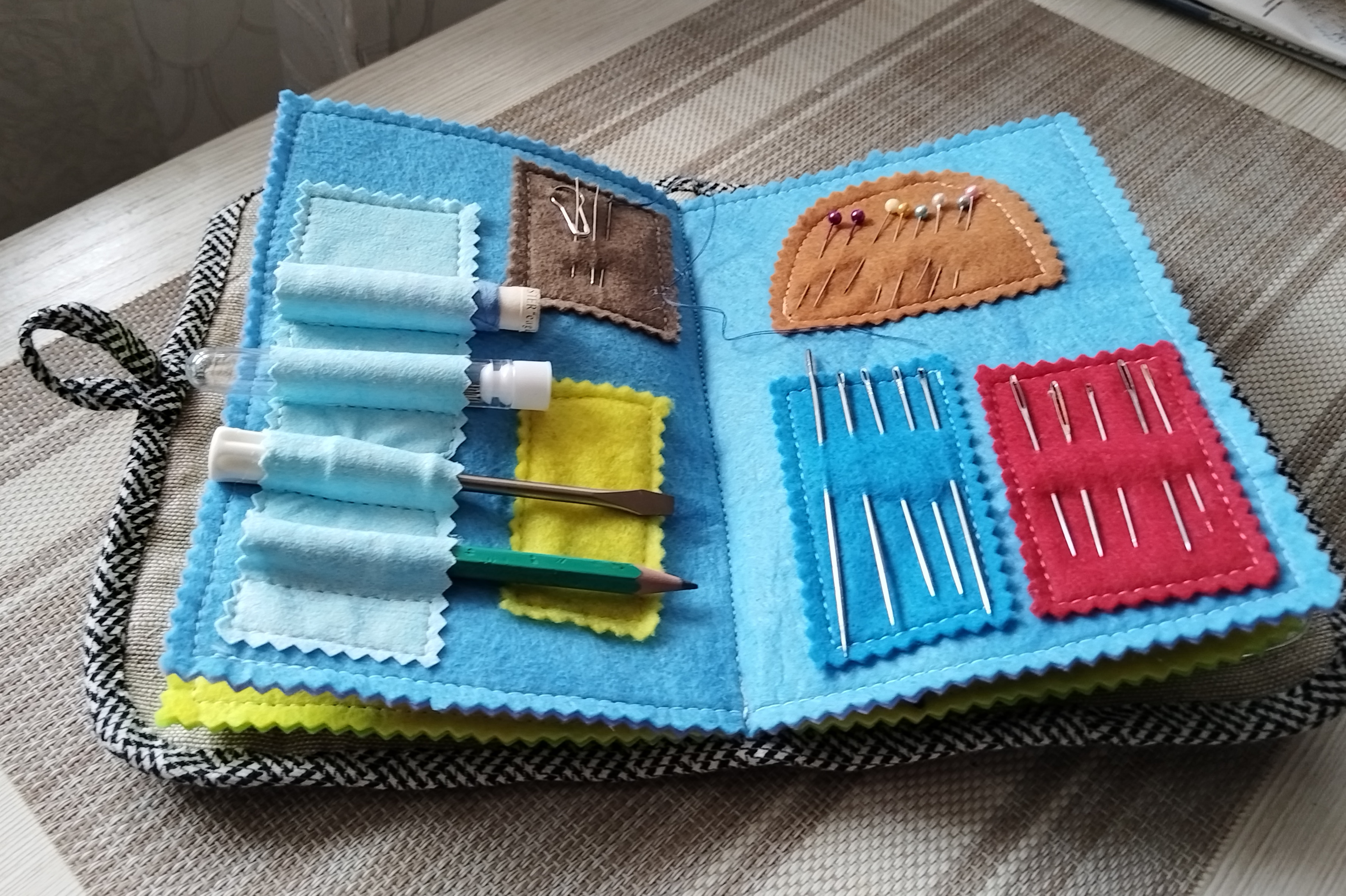 Весна вдохновляет на новые творческие идеи и поделки. И как тут обойтись без инструментов и приспособлений? Игольниц много, ящичков тоже, но хочется оптимальный вариант, открыл и вот оно - самое необходимое! Решила сделать органайзер для работы. Чехол сшила вручную из лоскуточков ткани, простягала, отделала пестрым кантиком. Странички органайзера из фетра, все составляющие пришивала на швейной машине, думаю, так прочнее и долговечнее. Застежка на пуговице. Заполняла кармашки с особым трепетом и радостью! Задача выполнена, начинаем творить!