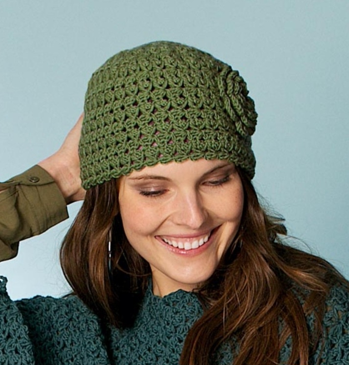 Шапка с интересным узором украшена крупным цветком, который можно выполнить как из той же пряжи, что и шапку, так и выбрать другой цвет.