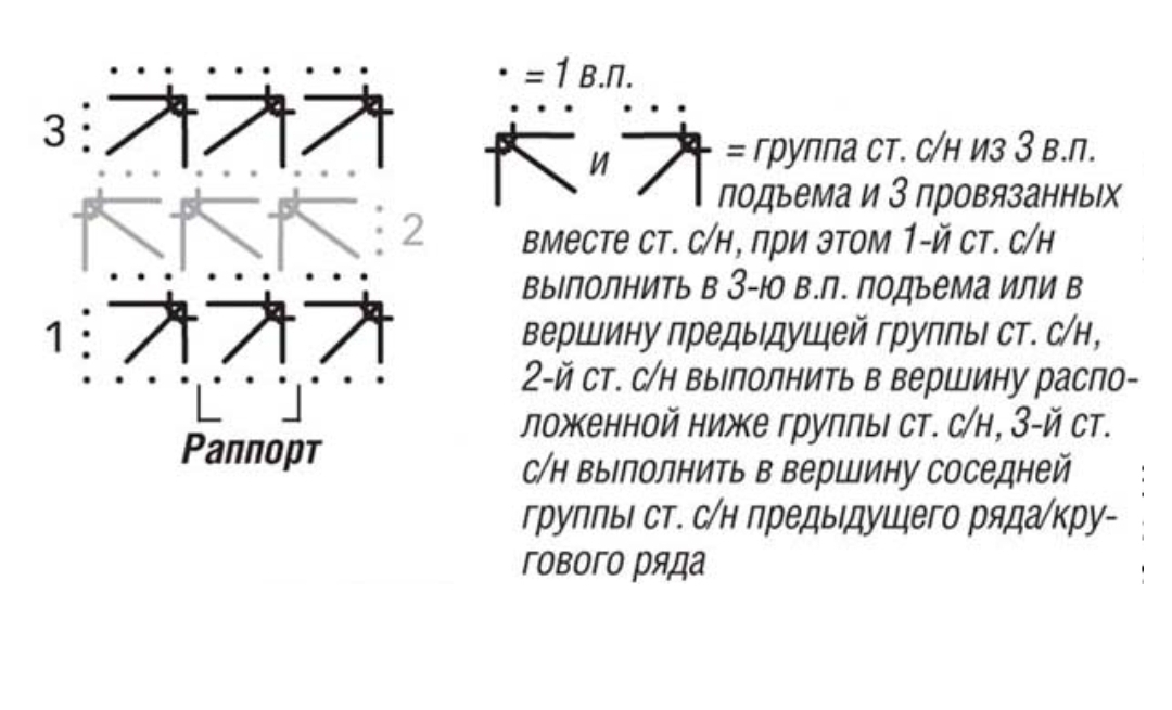 Начать с петель перед раппортом, раппорт постоянно повторять, закончить петлями после раппорта. После каждого ряда замыкать работу в кольцо с помощью 1 соед. ст. в 3-ю в.п. подъема. Поворачивать работу с помощью следующих 3 в.п. и вязать в противоположном направлении.