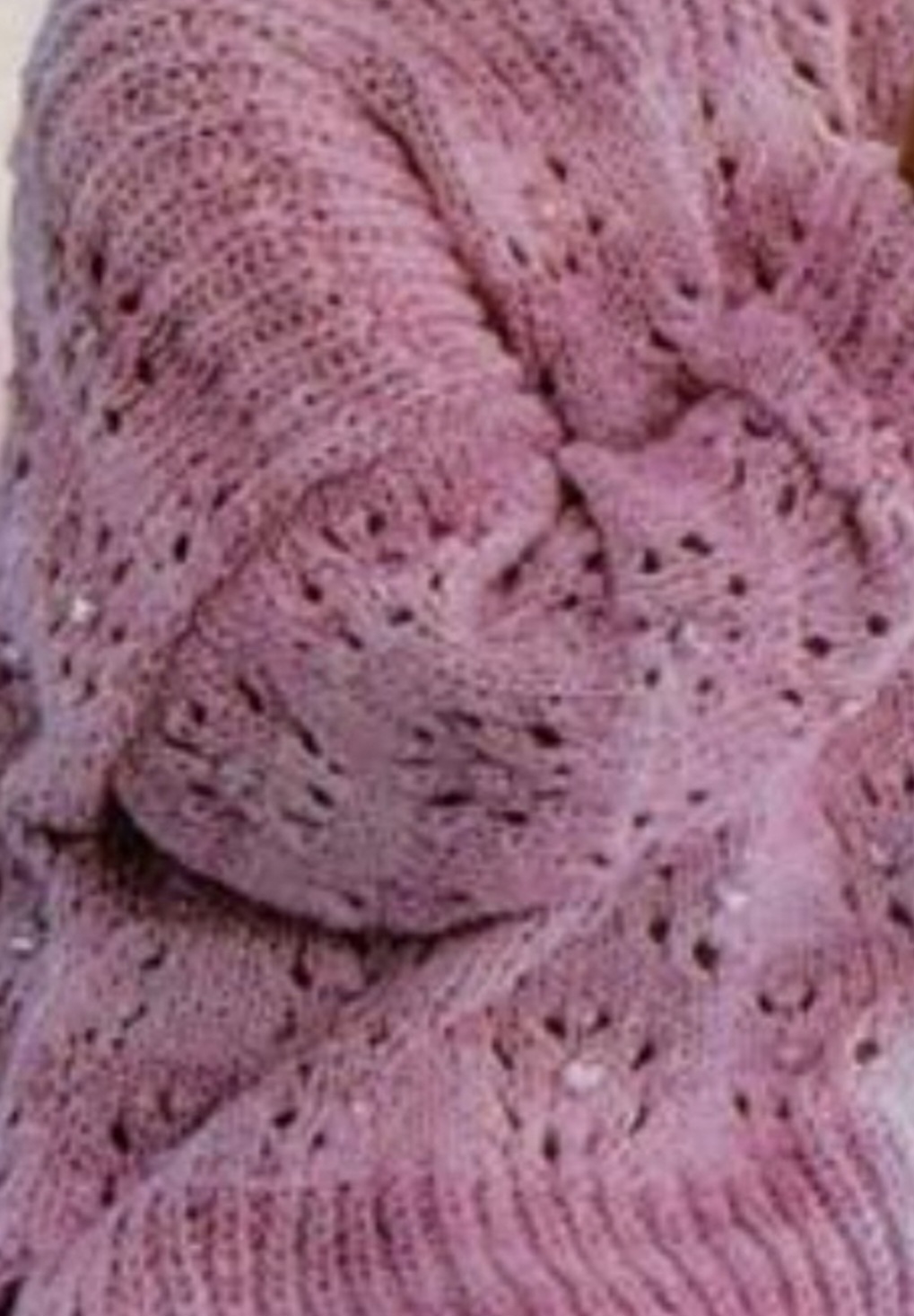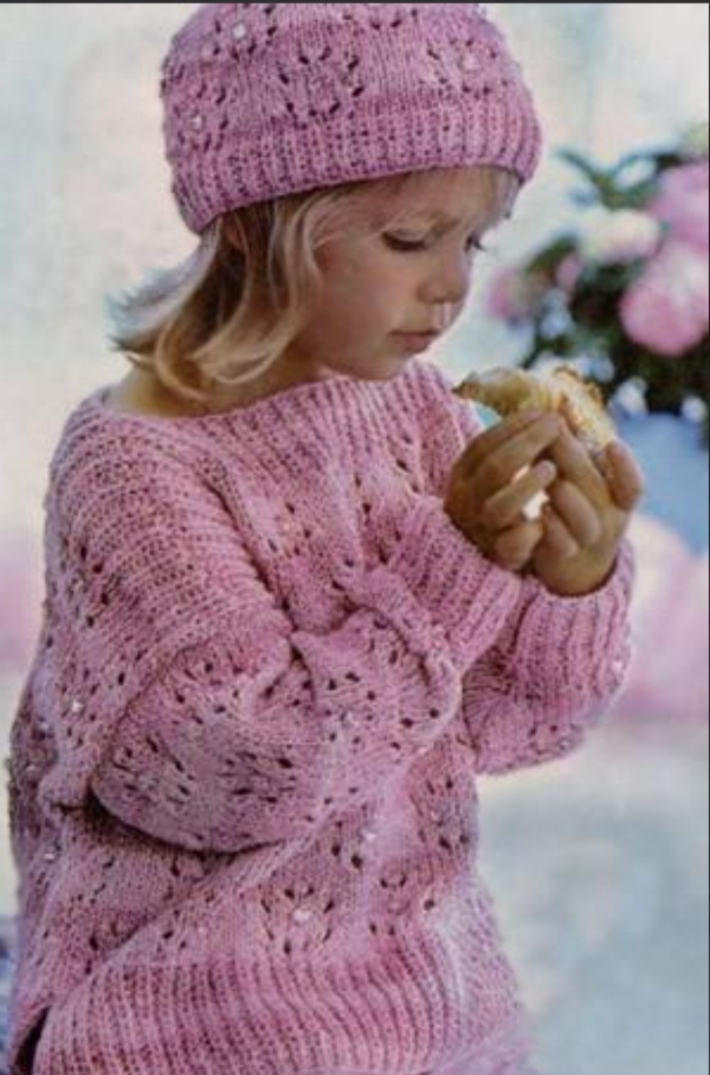 Материалы: пряжа (54%, 46% хлопок, 100 м/50 г) – 300(350) г розово на пуловер и 50 г на шапочку, 98 – 150 декоративных камешком для украшения пуловера и 14 для шапочки.