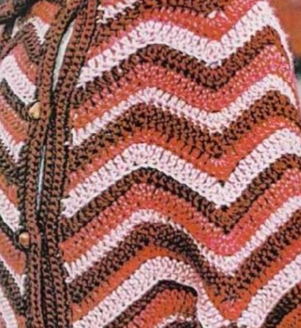 Обвязать кромочные края полочек нитью бордового цвета 6 р. ст. б/н учитывая, что последние 5 р. следует вязать ст. 6/н, вводя крючок за заднюю стенку.
