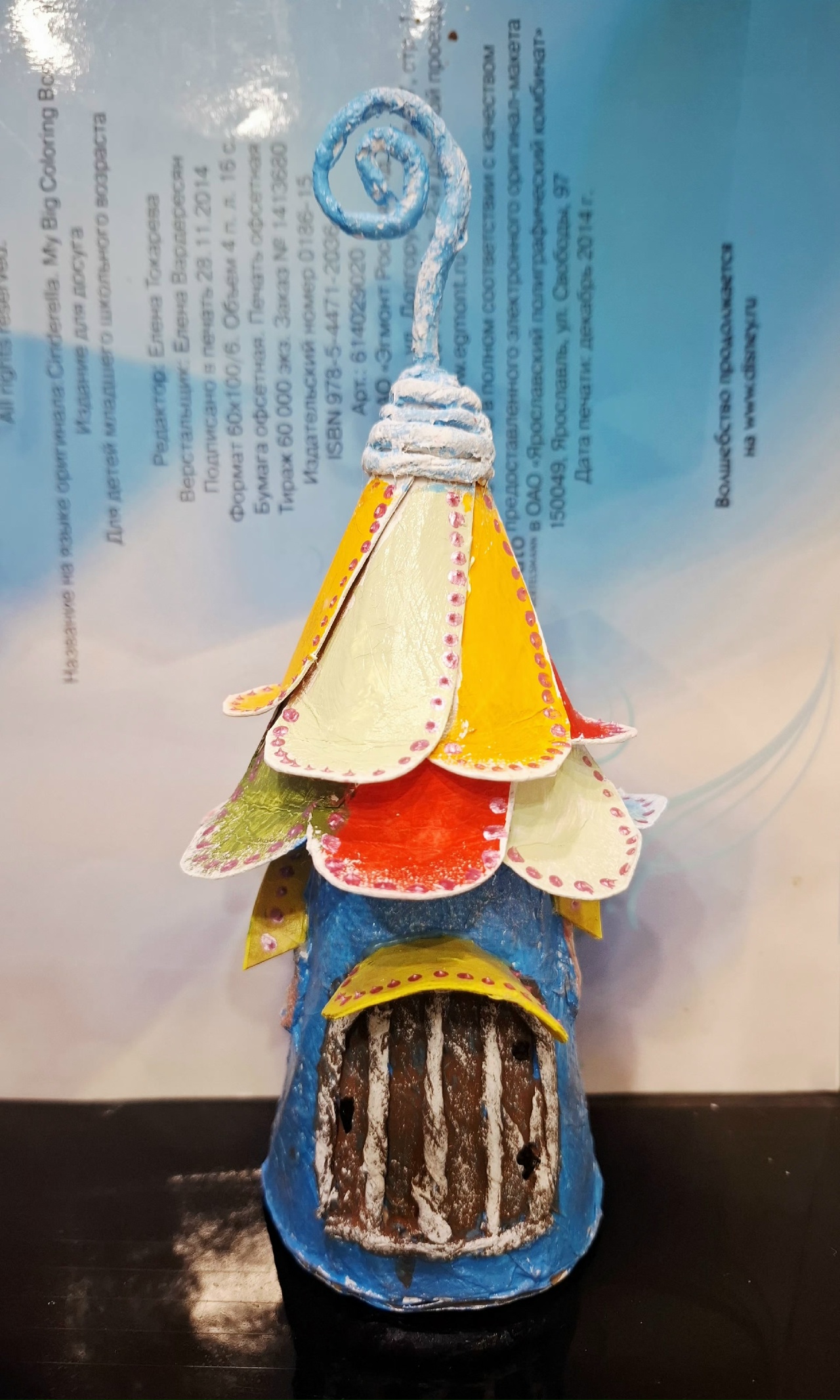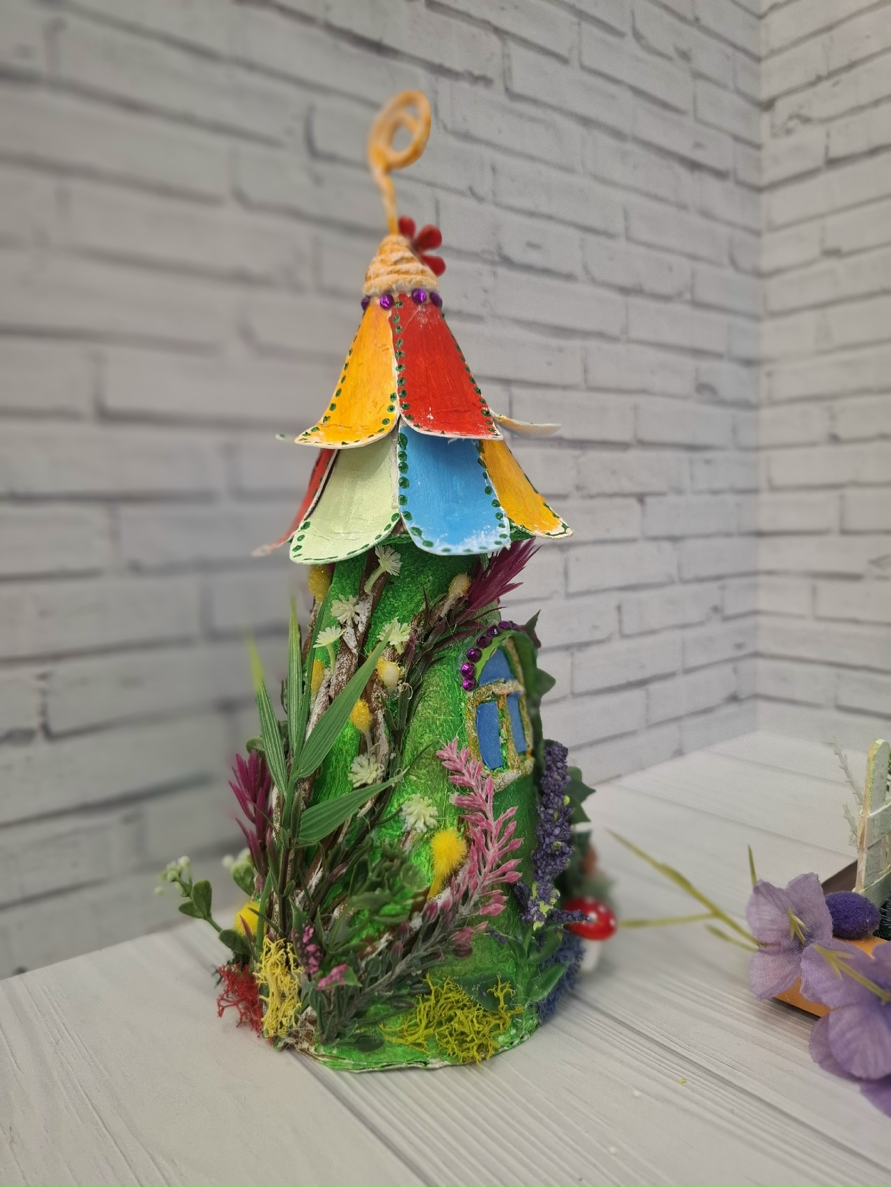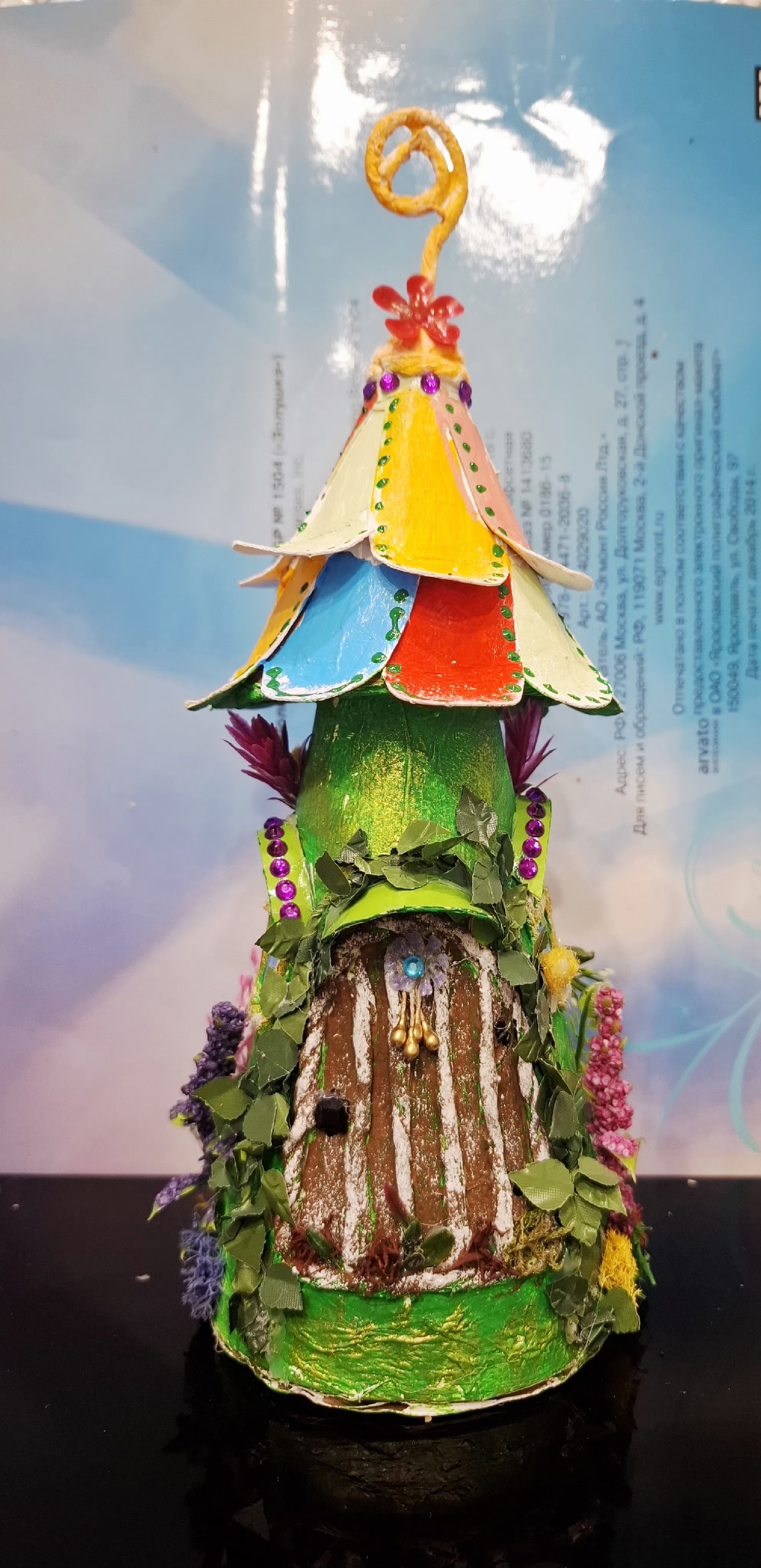 На крышу приклеить лепестки цветов из картона.Загогулинка на крыше- это проволока обкрученная салфеткой.