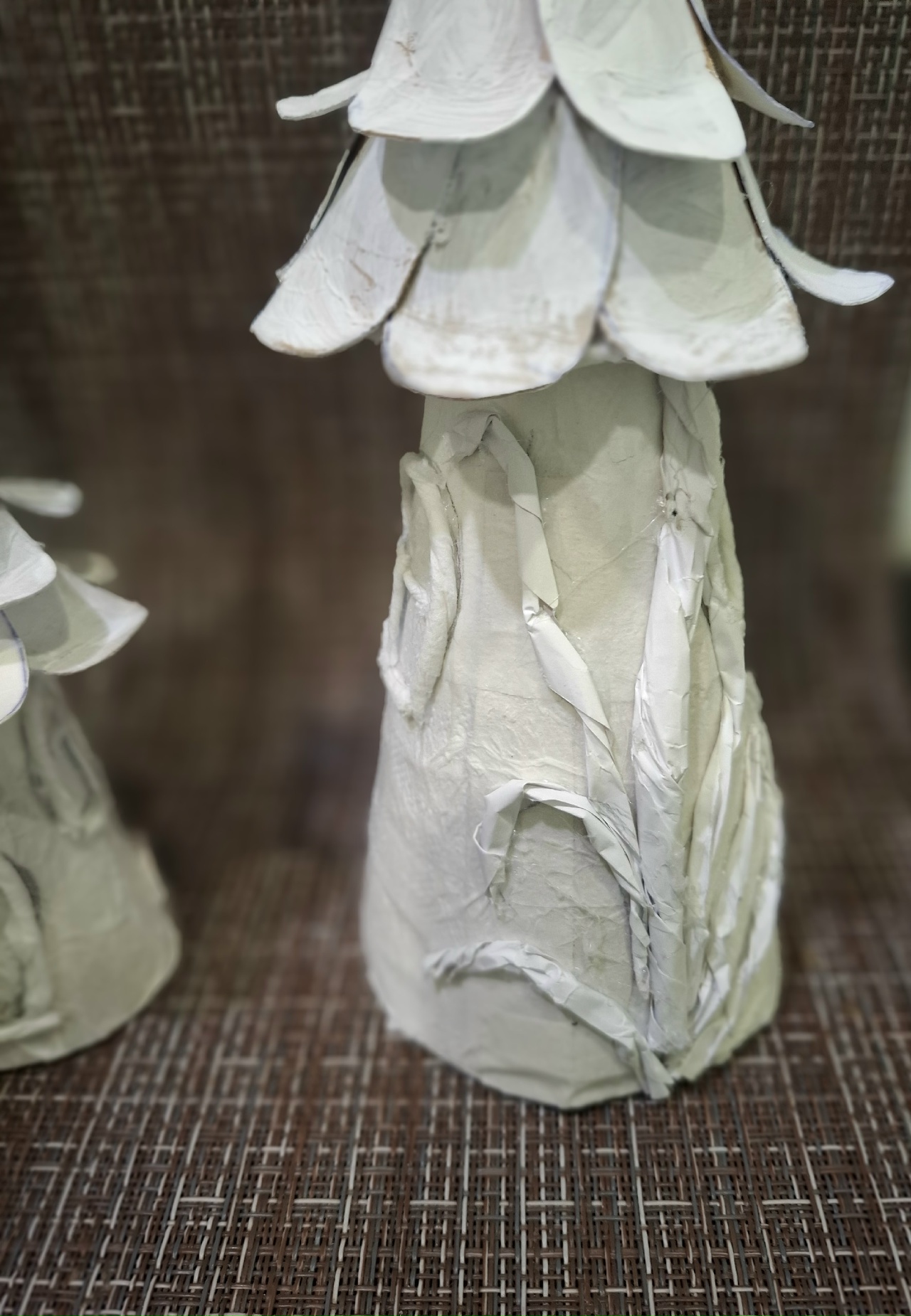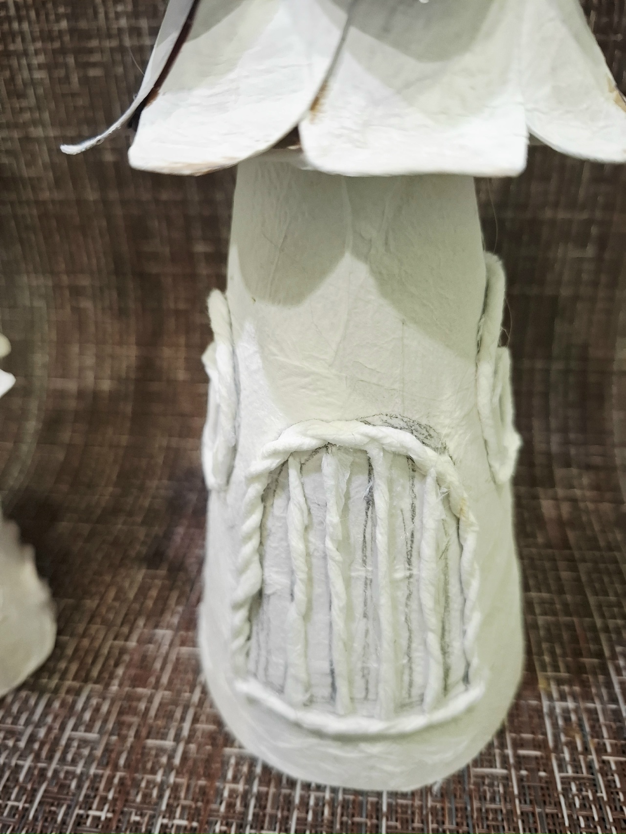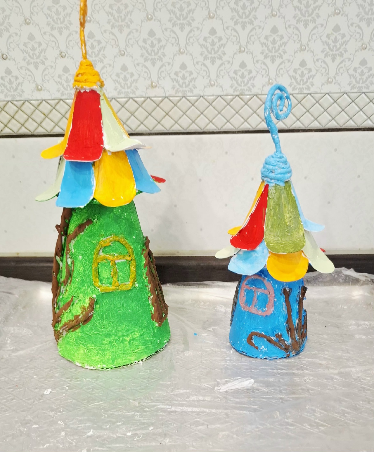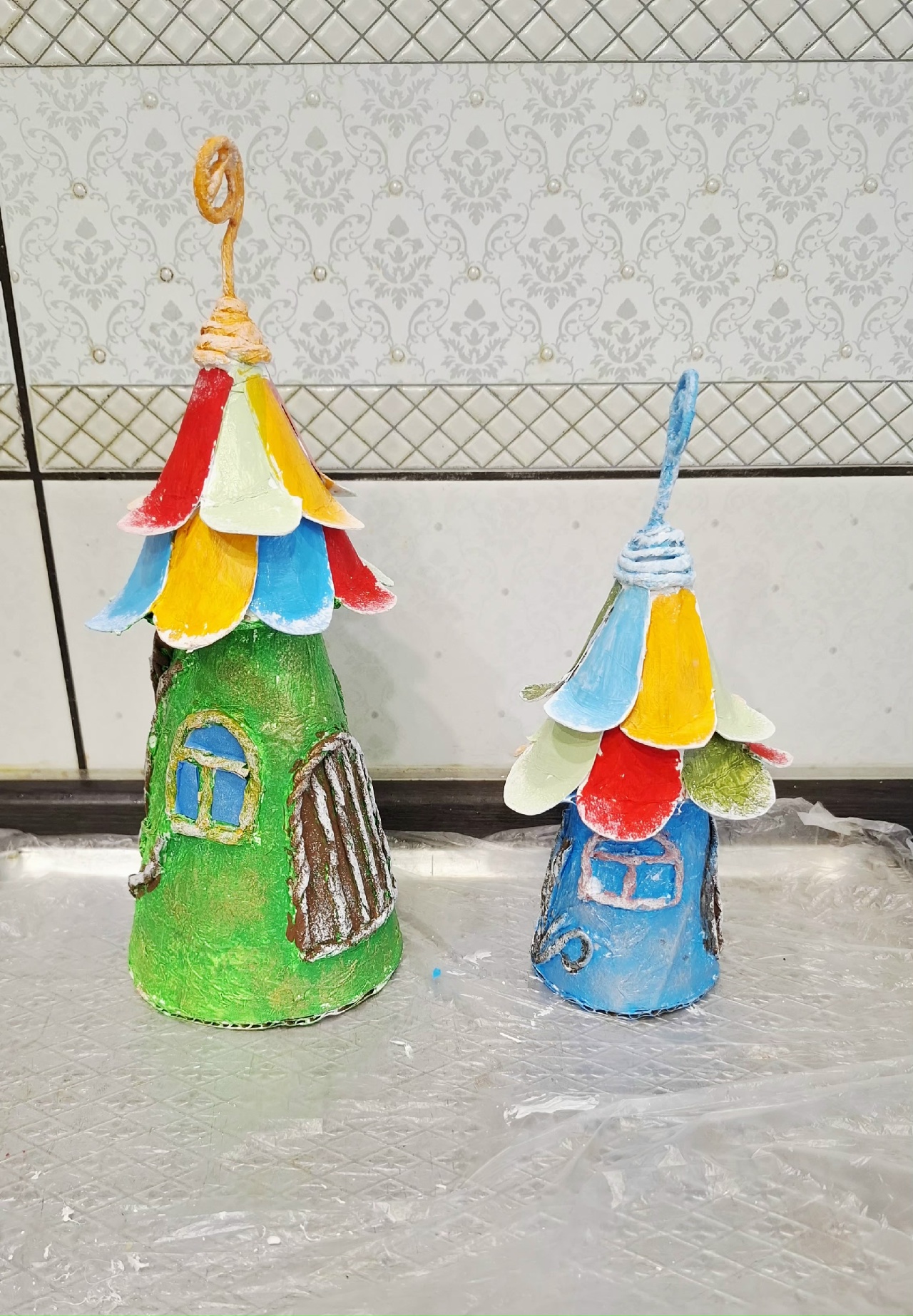 На крышу приклеить лепестки цветов из картона.Загогулинка на крыше- это проволока обкрученная салфеткой.