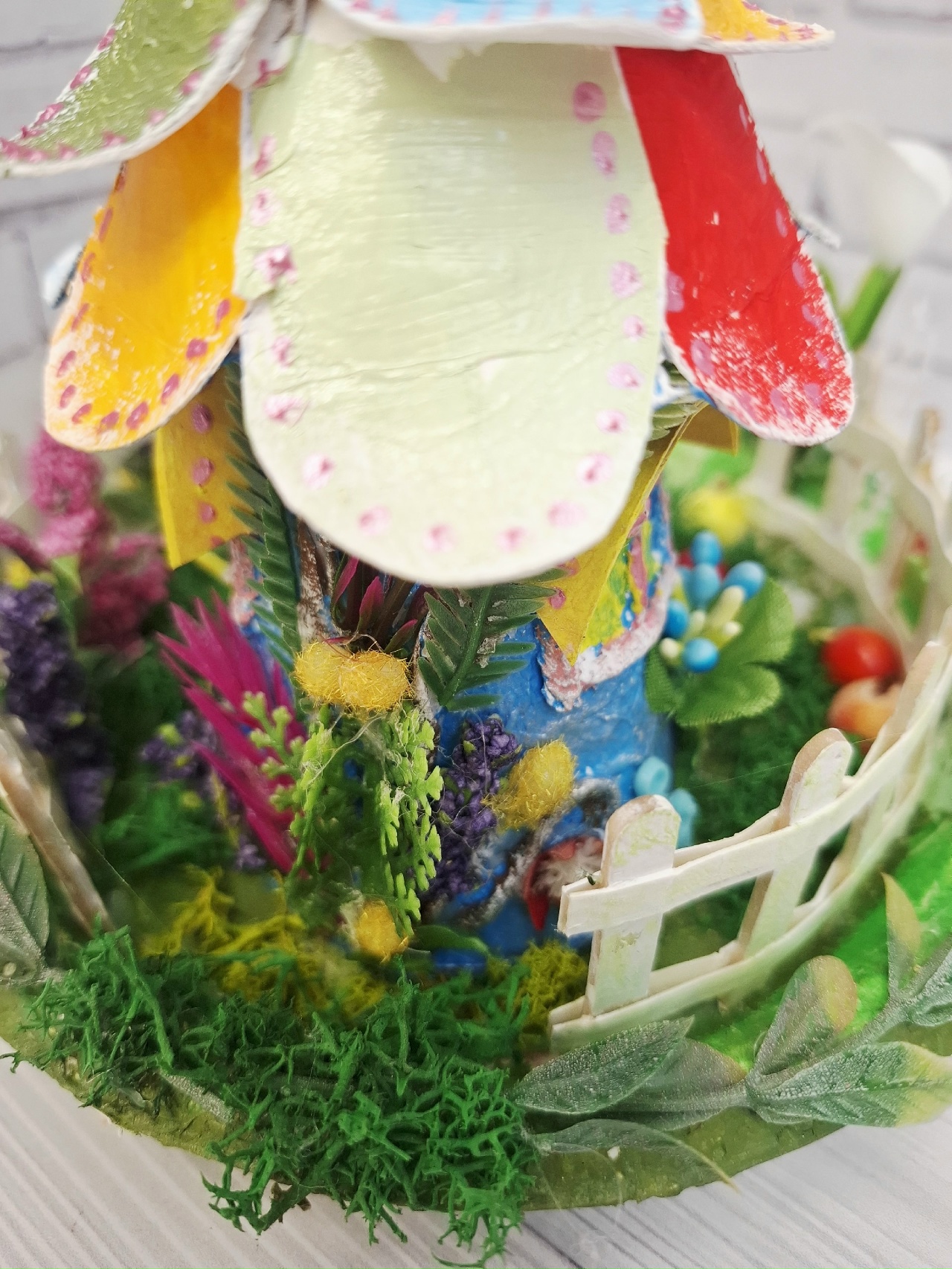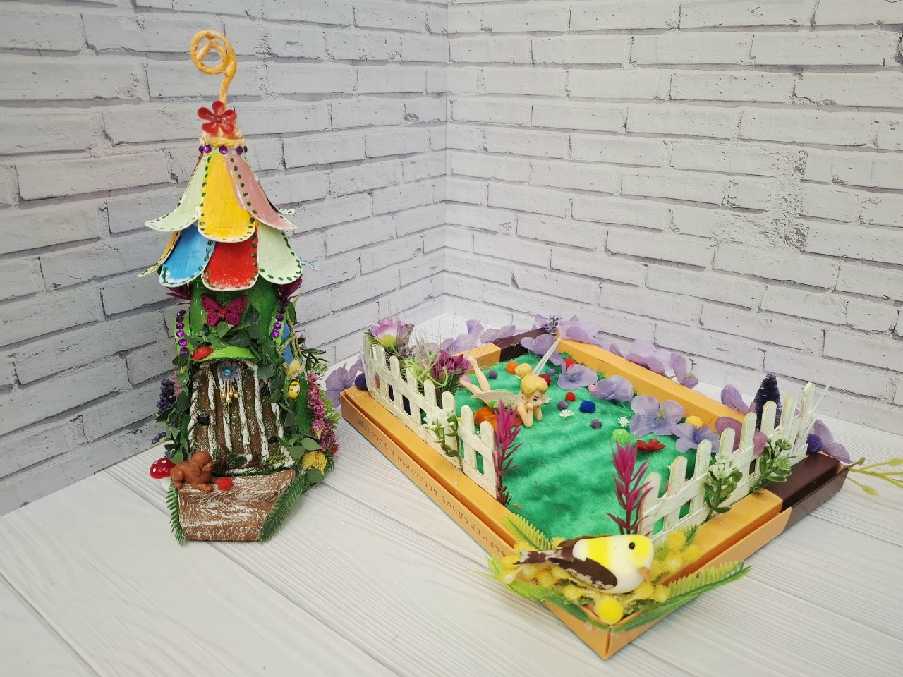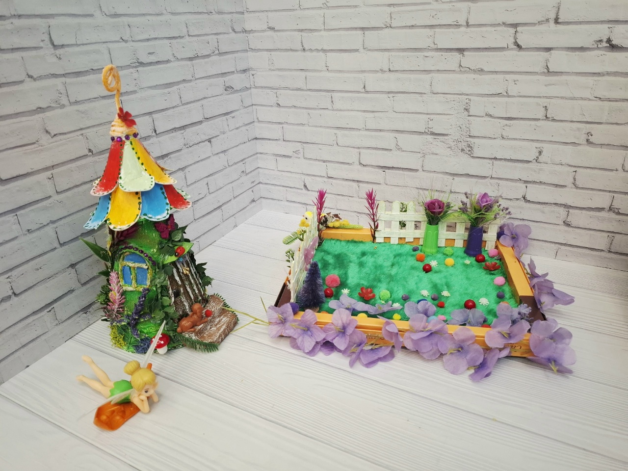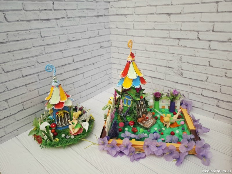 И все это сделано из "мусора": ненужных коробок,пластиковой тарелки.Покупные только феи и растения.Хотя и растения можно сделать самим.У меня просто много цветов уже в наличие, использую их для своих работ.