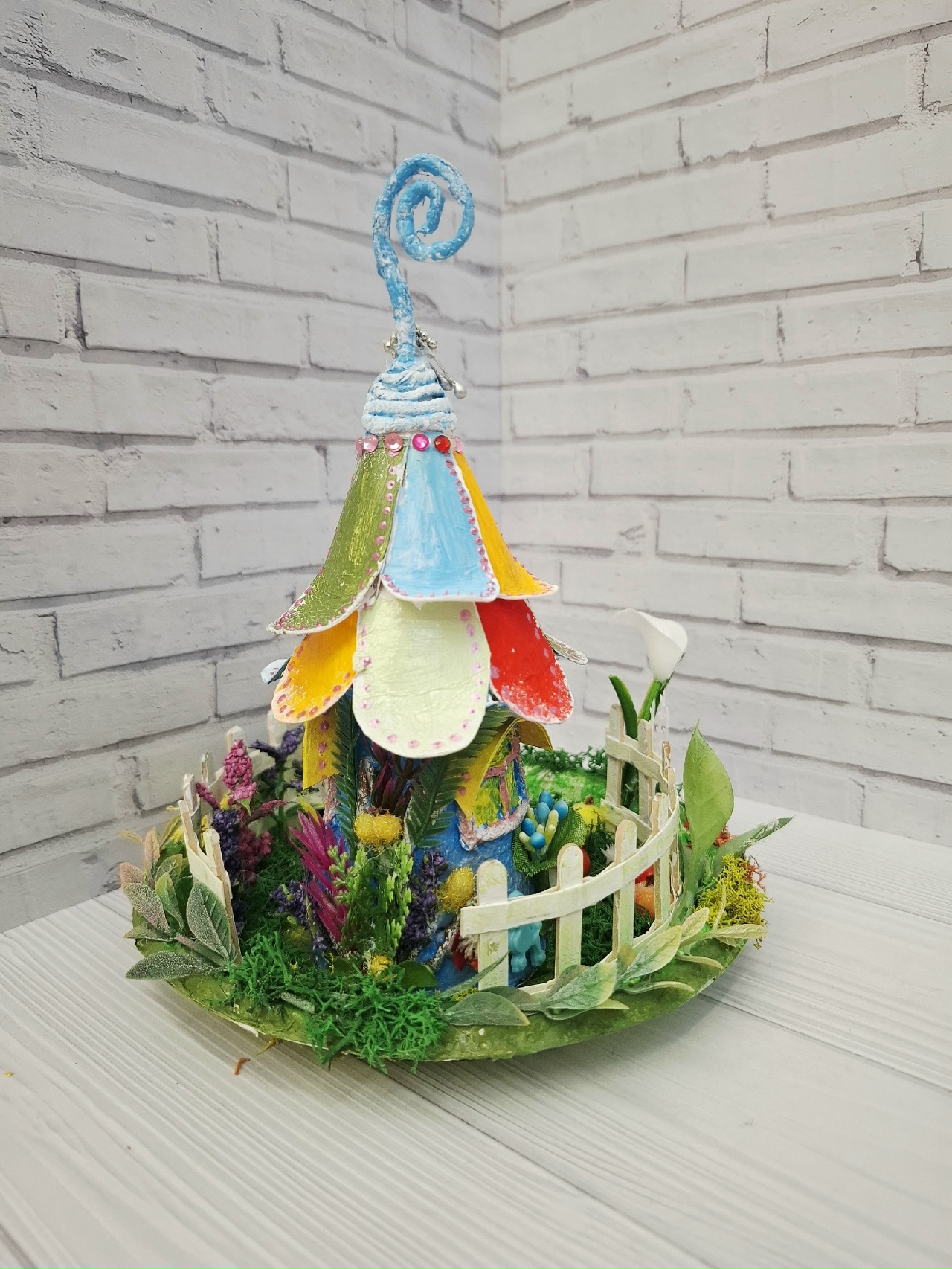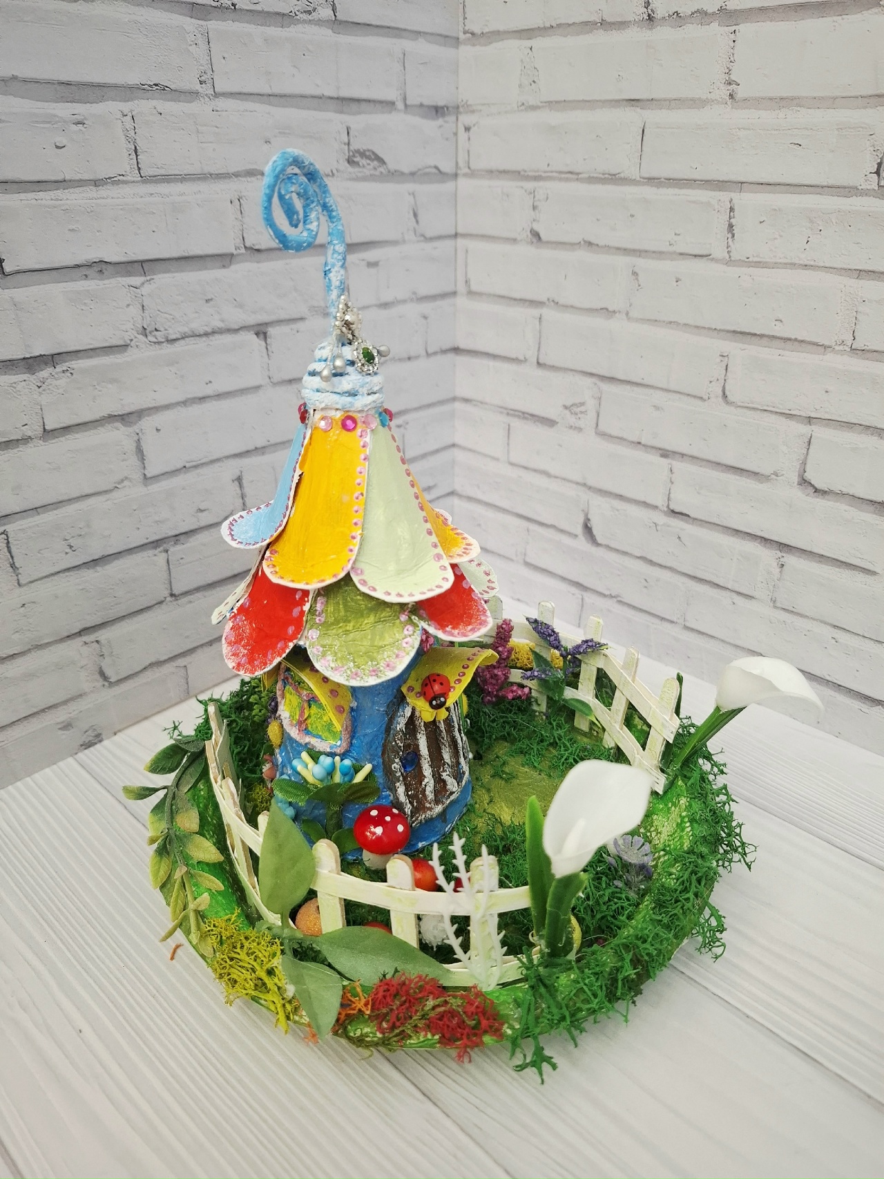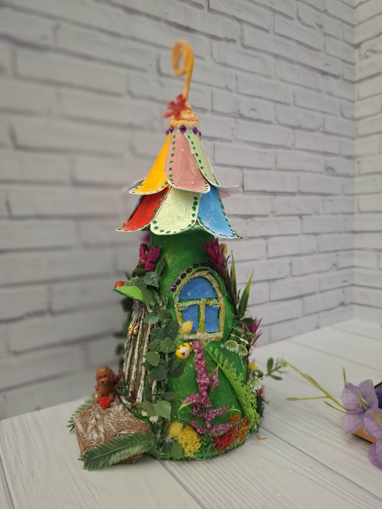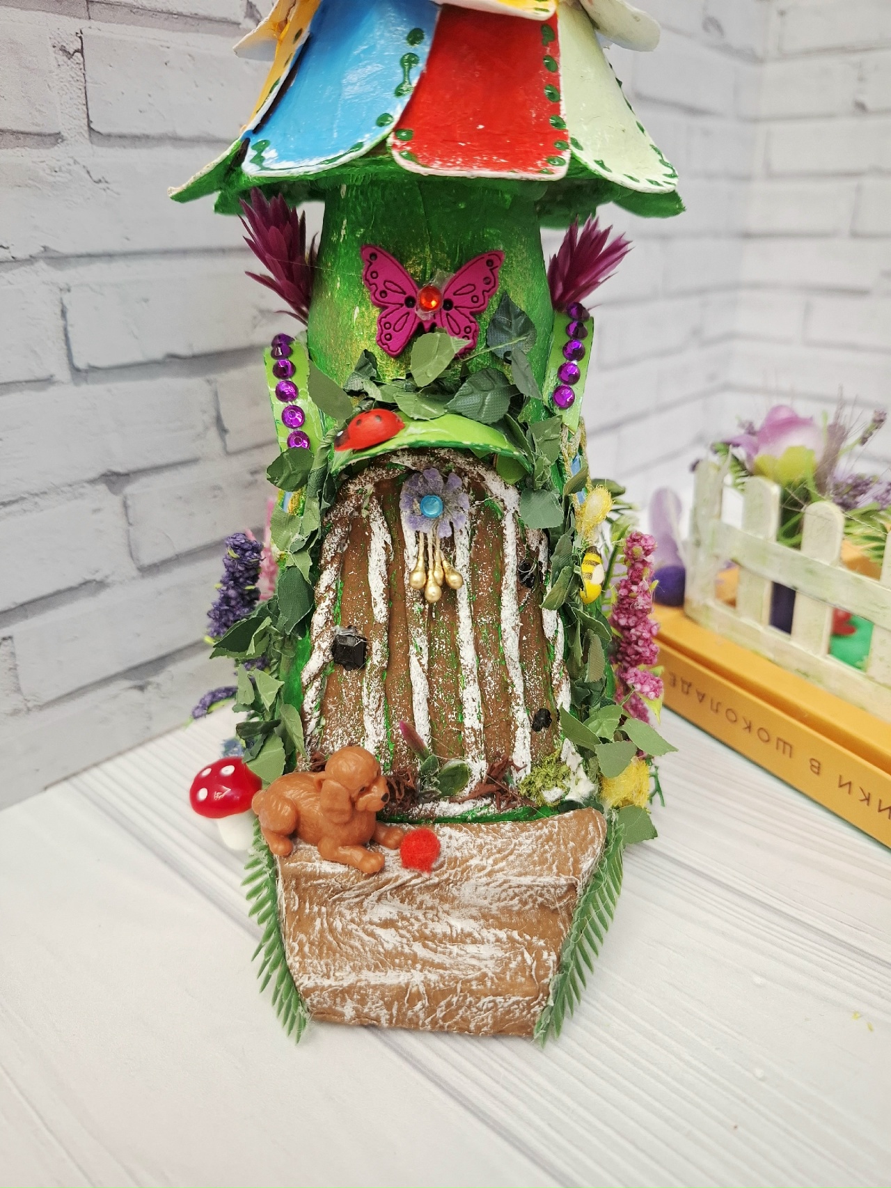 Стены украсила искусственными растениями и цветами.Дверь украсила стразами.На козырьки окон приклеила стразы