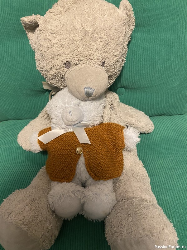 Внук уже и не спит с ним, в поездки не берет, поэтому надо Мишу привести в порядок и на заслуженный отдых отправить. Был Миша такой пушисто-мягкий и нежно-голубой , как Гулена, который сидит у него на коленях. Мишу на прогулки и занятия не брали, чтобы чистый был, только в путешествия. А Гулена на все занятия ходил, спортивные и развивающие. Вон даже с внуком жилеточку ему связали)))