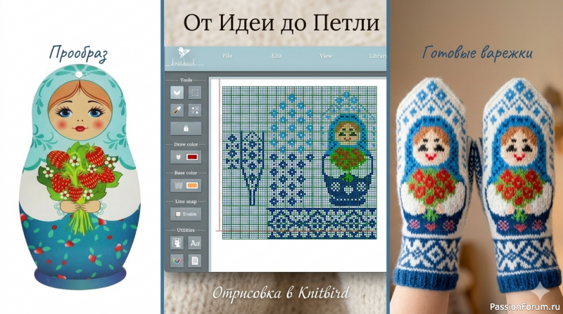 На коллаже видно, как я отрисовывала схему в Knitbird, опираясь на прообраз деревянной игрушки. Каждая клетка — это одна петля. Я всегда стараюсь делать схемы максимально четкими (в HD-качестве), чтобы глаза не уставали.