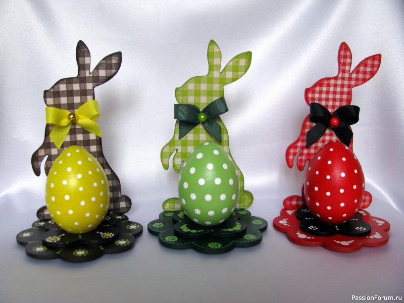 Вот такие бравые зайцы, в нарядных костюмах и при галстуке, у меня получились. Под стать каждому - пасхальное яйцо.