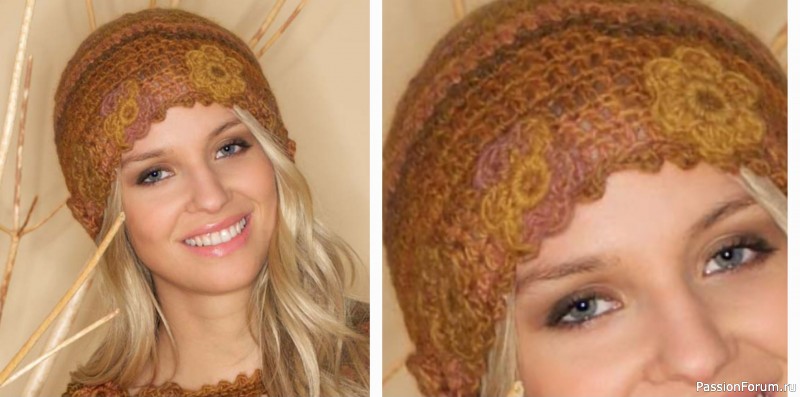 Интересная и несложная в исполнении шапка, украшенная по нижнему краю цветами.