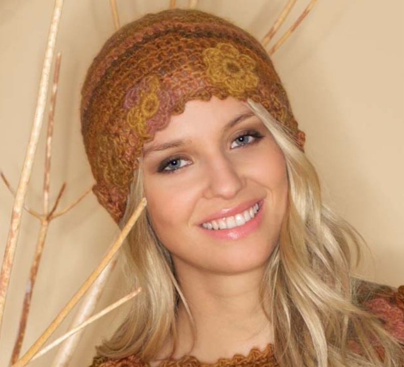 Нижний край шапки обвязать крючком № 4,5 1 круговым рядом пико: 1 соед. ст., * 3 в.п., 1 соед. ст. в 1-ю в.п., пропустить 1 ст. б/н, 1 соед. ст., от * постоянно повторять. Цветки пришить к нижнему краю шапки, равномерно распределив.
