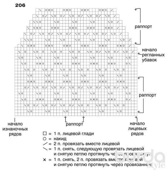 Затем перейти на спицы №3 и продолжить вязание ажурным узором по схеме. При этом с обеих сторон после/перед кромочной убавлять по 1 п. поочередно в каждом 4 и 6-м р. до тех пор, пока на спицах не останется 107 (119) 131 п.