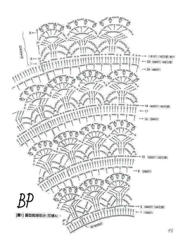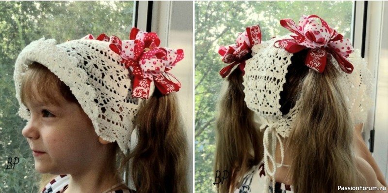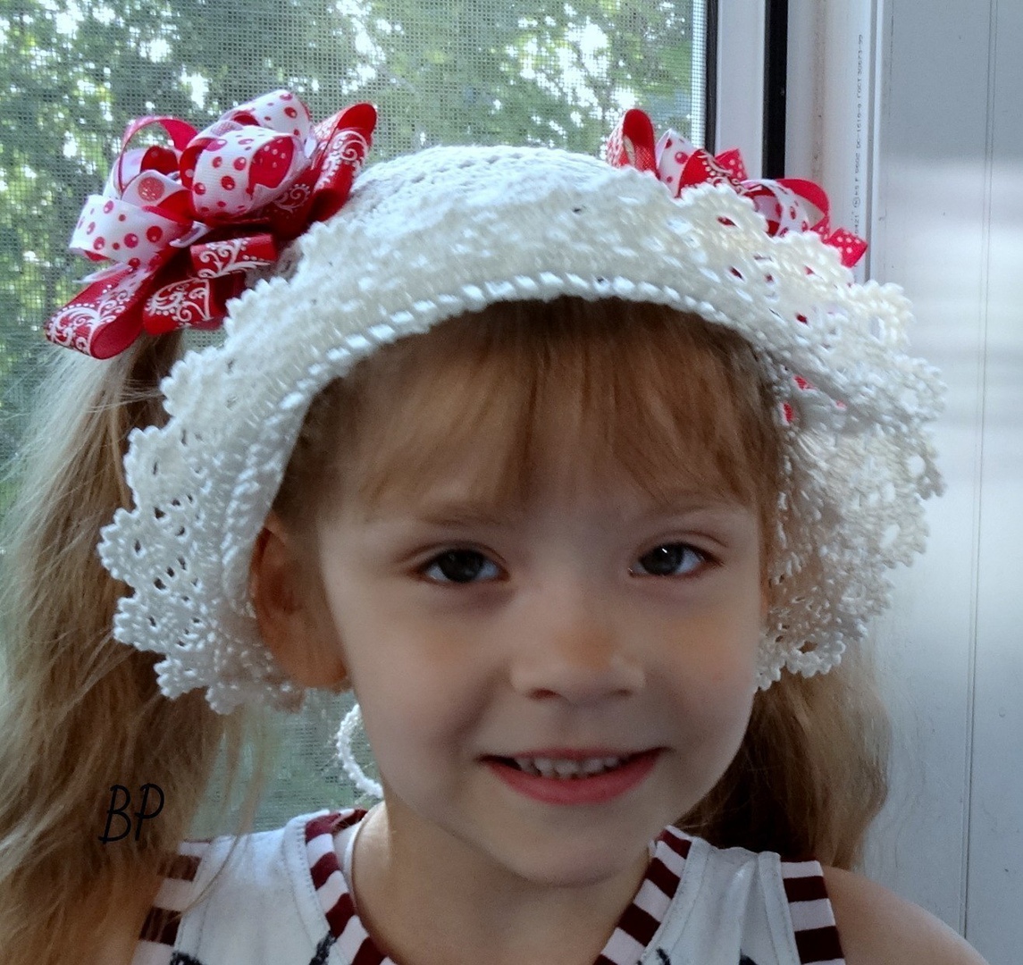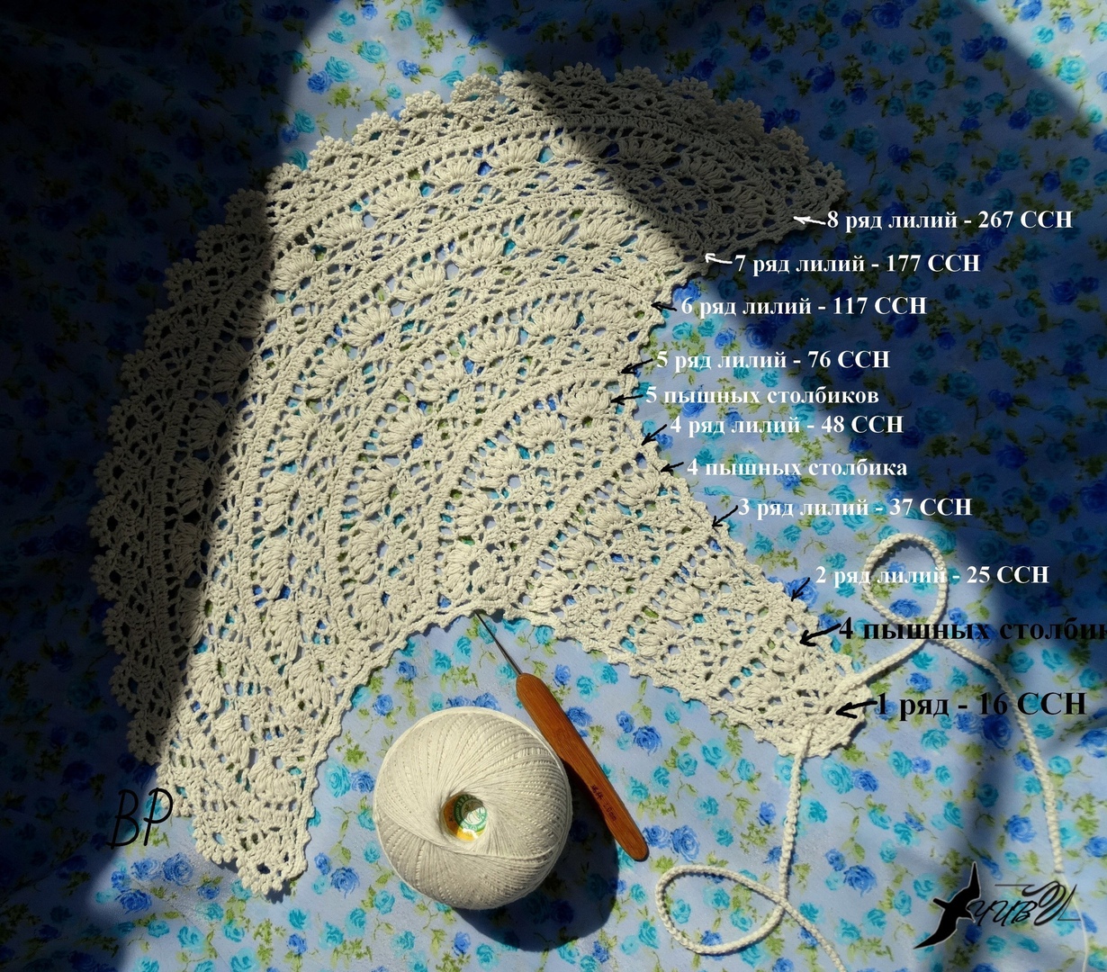 Панама очень проста в исполнении. Набираем 16 ВП +3 петли подъема, затем вяжем ряд ССН, и далее по схеме 1, постепенно прибавляя количество лилий в узоре. После трех раппортов переходим на схему 2 и вяжем еще 4 раппорта. В последнем 5 ряду лилий пышные столбики не делаем, вместо них провязываем ряд столбиков с пико. После этого обвязываем бочка - 1 ряд арочки из 4 ВП, 2 ряд 5 СБН с пико. Вдеть шнурочек для завязок или пришить пуговицы, панама готова.