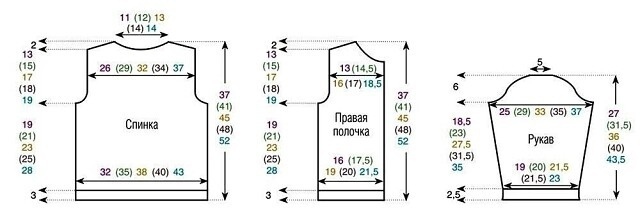 Через 35 (39) 43 (46) 50 см от начального ряда закрыть с обеих сторон для плечевых скосов 1 х 4 п., затем в каждом следующем 2-м р. 1х4 п. и1х5п. (1х4 п., затем в каждом следующем 2-м р. 2 х 5 п.) 1 х 5 п., затем в каждом следующем 2-м р. 2 х 5 п. (1 х5 п., затем в каждом следующем 2-м р. 1 х 5 п. и 1 х 6 п.) 1 х 6 п., затем в каждом следующем 2-м р. 2 х 6 п.