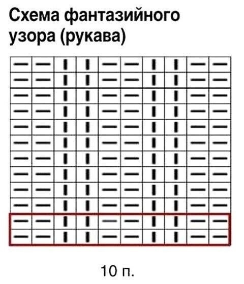 Перейти на спицы № 6 и продолжить работу рельефным и фантазийным узорами по схеме, при этом петли распределить следующим образом: 22 п. фантазийного узора и 7 (9) 11 (13) 15 п. рельефного узора.