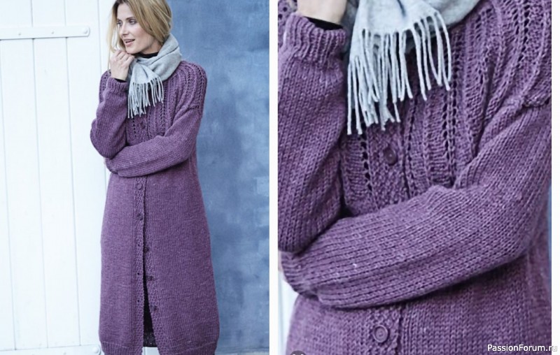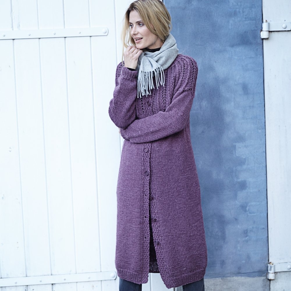 Пряжа Novita «Isoveli» (75% шерсти, 25% полиамида; 100 г/130 м) — 9 (10) 10 (11) 11 мотков ежевичной (№073); круговые спицы №5 и 6 длиной 80 см; круговые спицы №5 и 6 длиной 40 см (для выреза горловины); 9 пуговиц; маркеры петель.