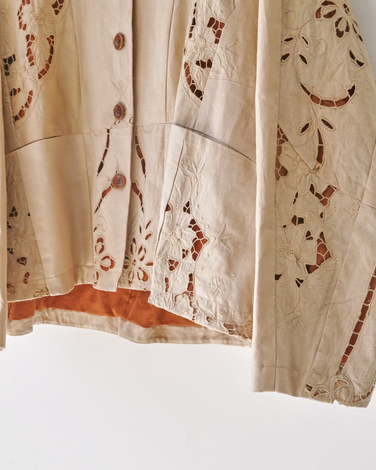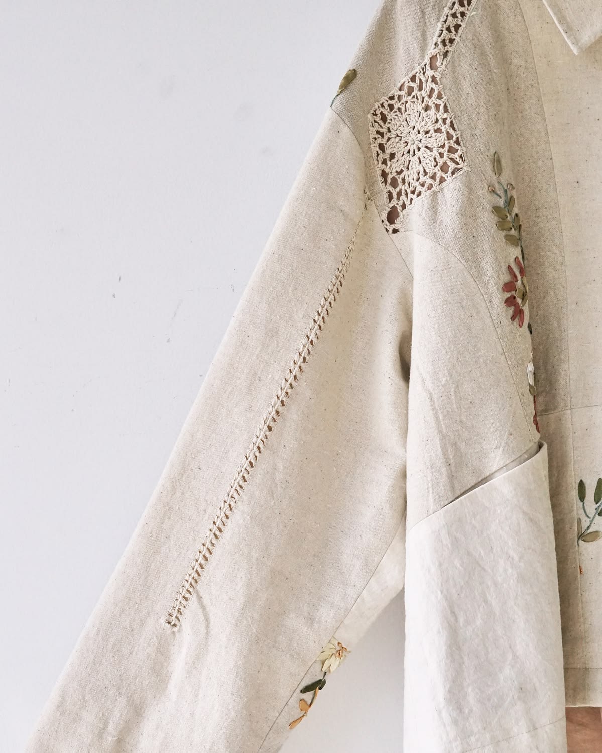 "Винтажные льняные простыни, выцветшие шторы, обрезки скатертей — каждый фрагмент ткани несёт в себе следы времени, неровности, потёртости, которые не могут быть случайными. Это не дефекты, а живые отголоски истории. Мы отбираем их по всему миру, выбирая те, что сохранили форму, текстуру и историческую память. Работа с ними — как диалог с прошлым.