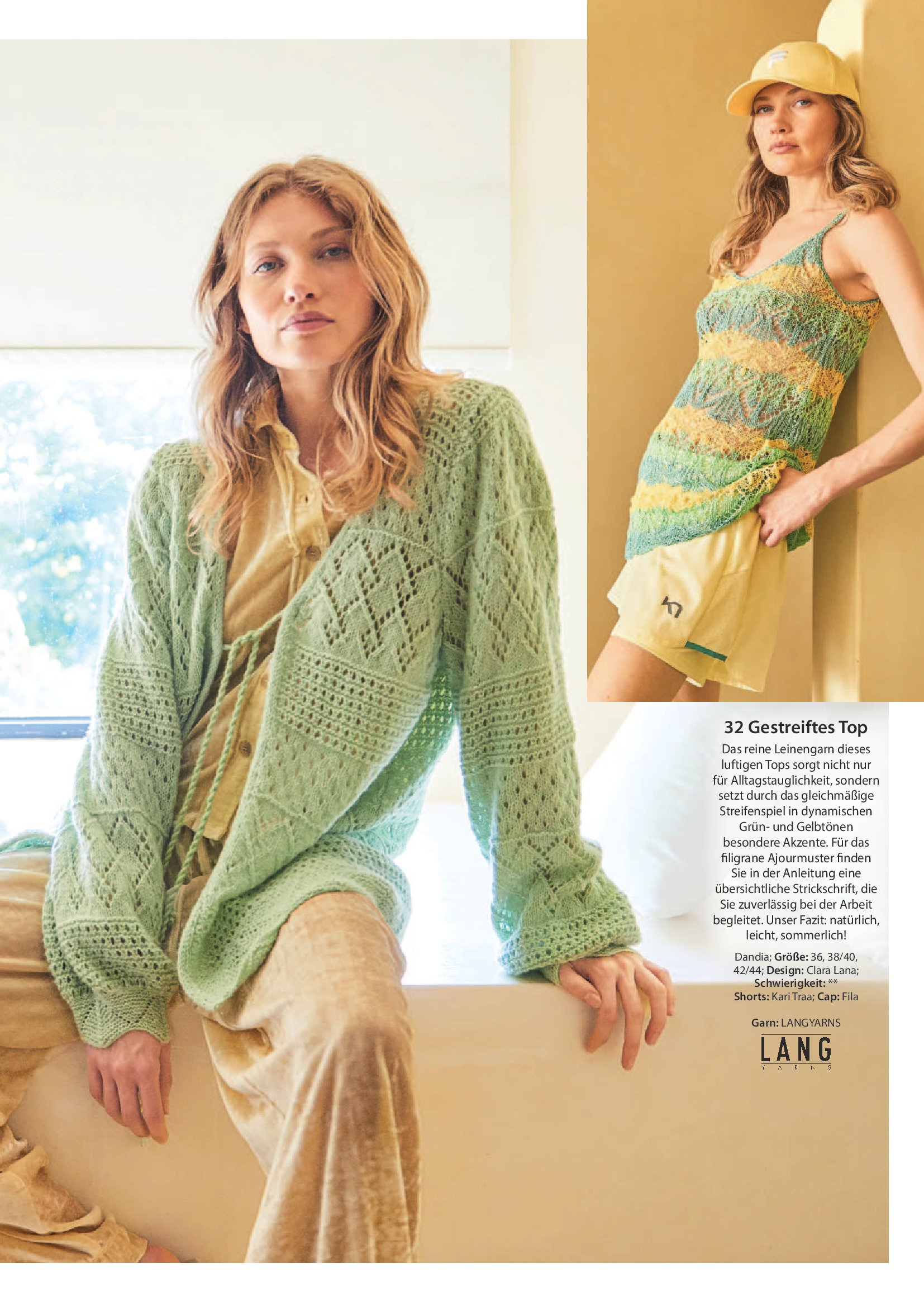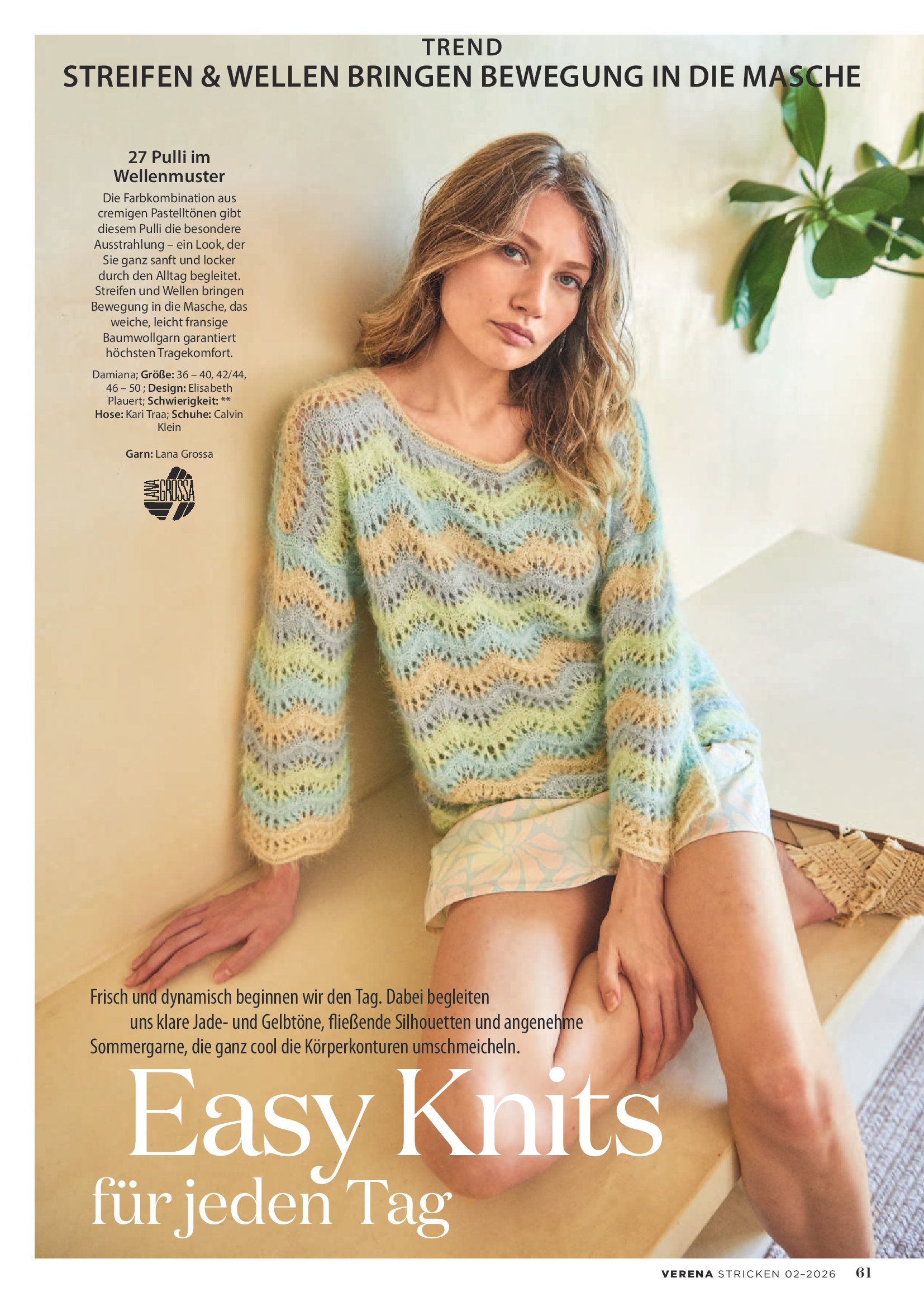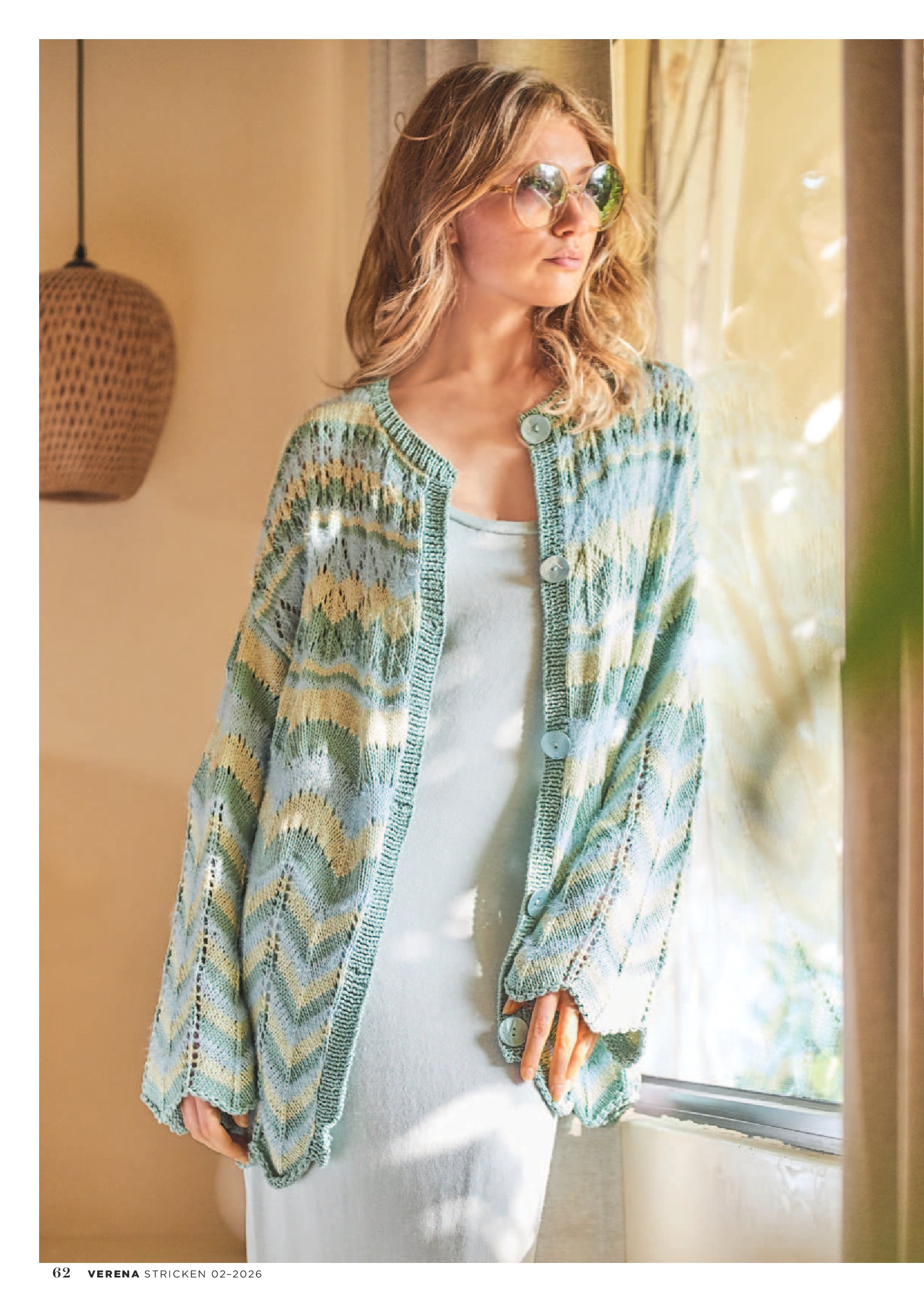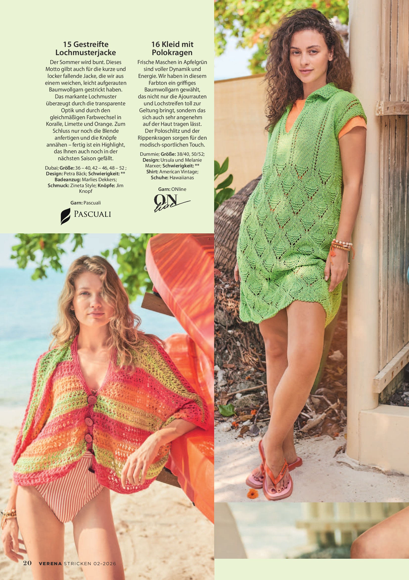 Легкие, игривые, прозрачные – таков девиз текущего выпуска № 2/2026 нашего тренда вязания VERENA: Легкость и воздушность на протяжении всего лета! Наше кредо: Этим летом вязаная одежда минималистична и чиста. Это отражается в прозрачных ажурных структурах и сетчатых узорах, а также в дышащих вязаных изделиях. Крой облегающий, но не тесный, позволяющий воздуху свободно циркулировать.