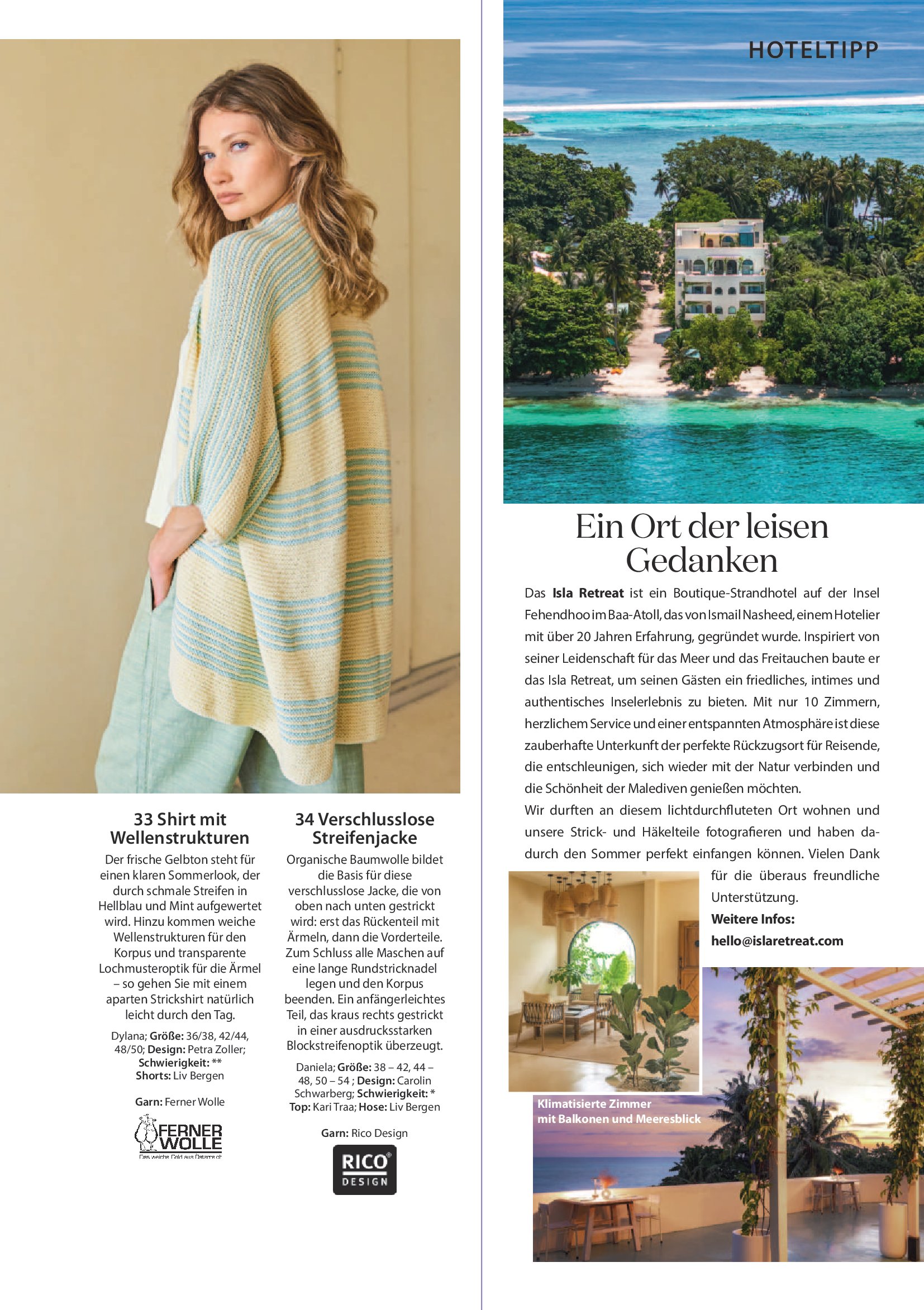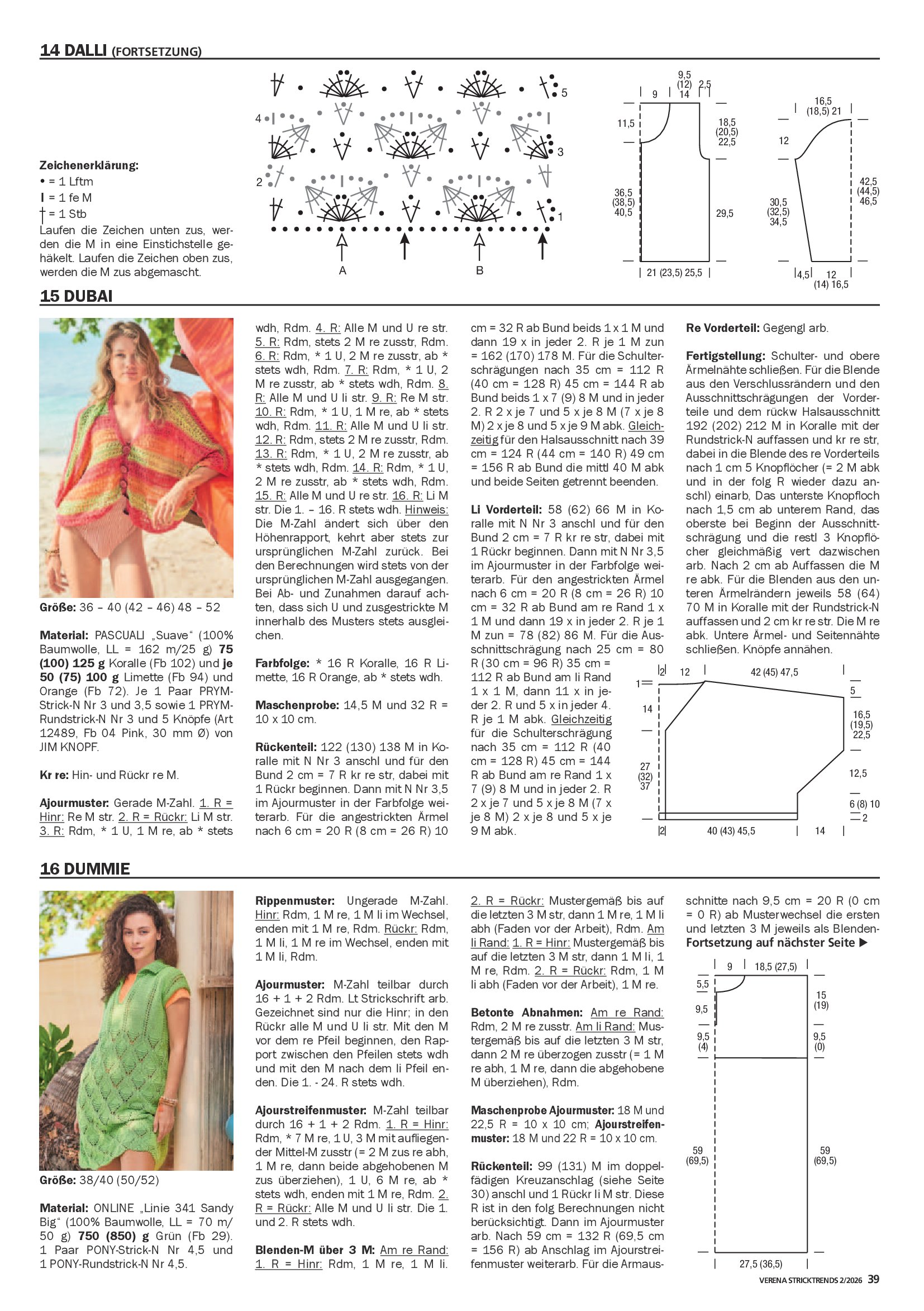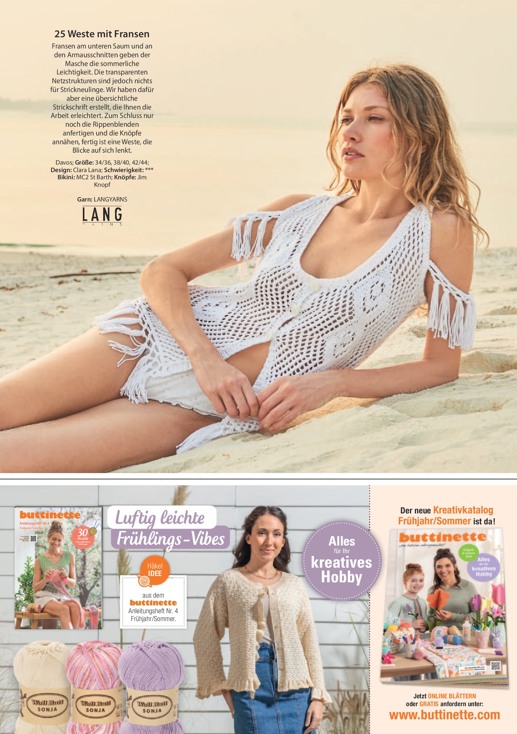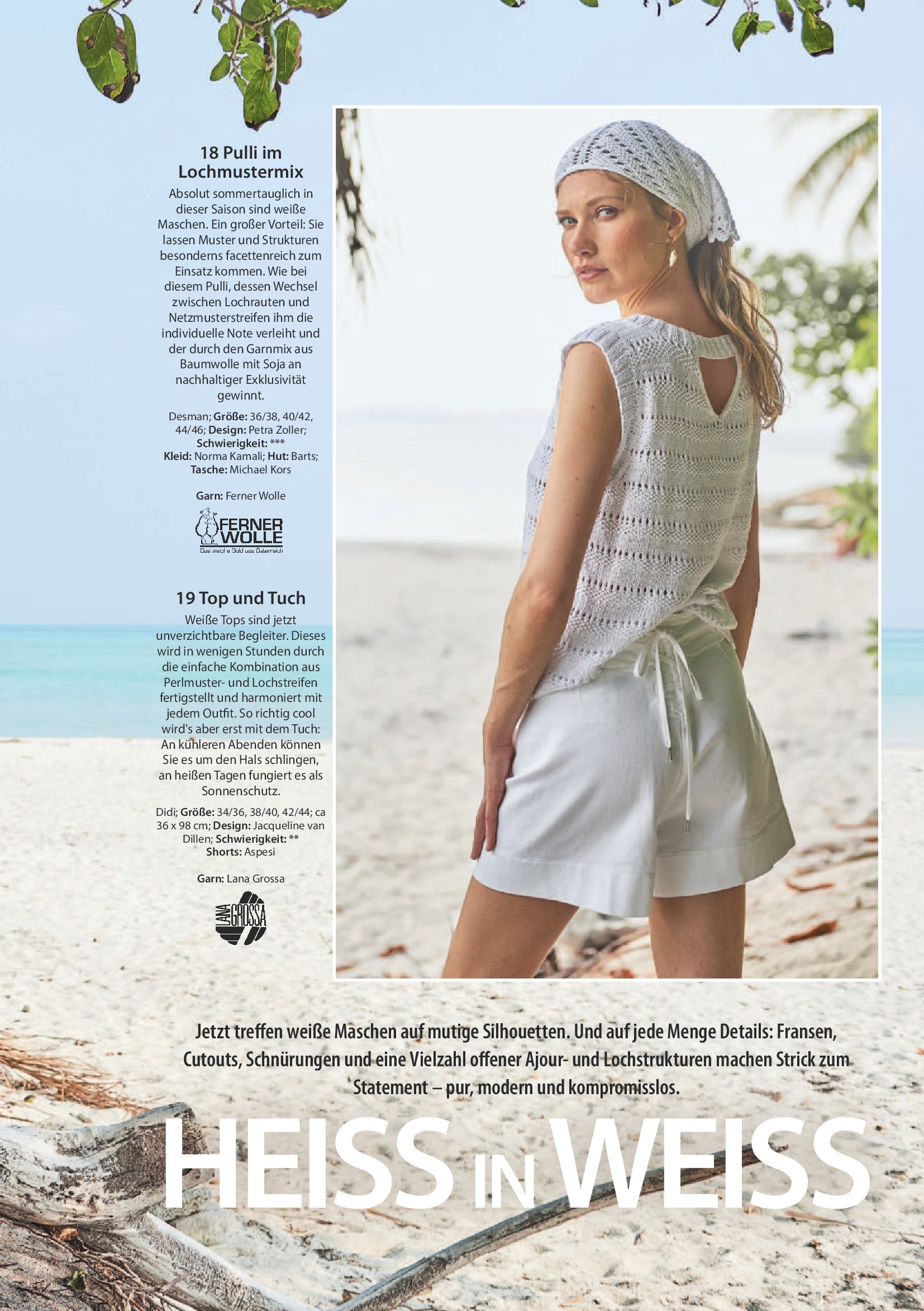 Легкие, игривые, прозрачные – таков девиз текущего выпуска № 2/2026 нашего тренда вязания VERENA: Легкость и воздушность на протяжении всего лета! Наше кредо: Этим летом вязаная одежда минималистична и чиста. Это отражается в прозрачных ажурных структурах и сетчатых узорах, а также в дышащих вязаных изделиях. Крой облегающий, но не тесный, позволяющий воздуху свободно циркулировать.