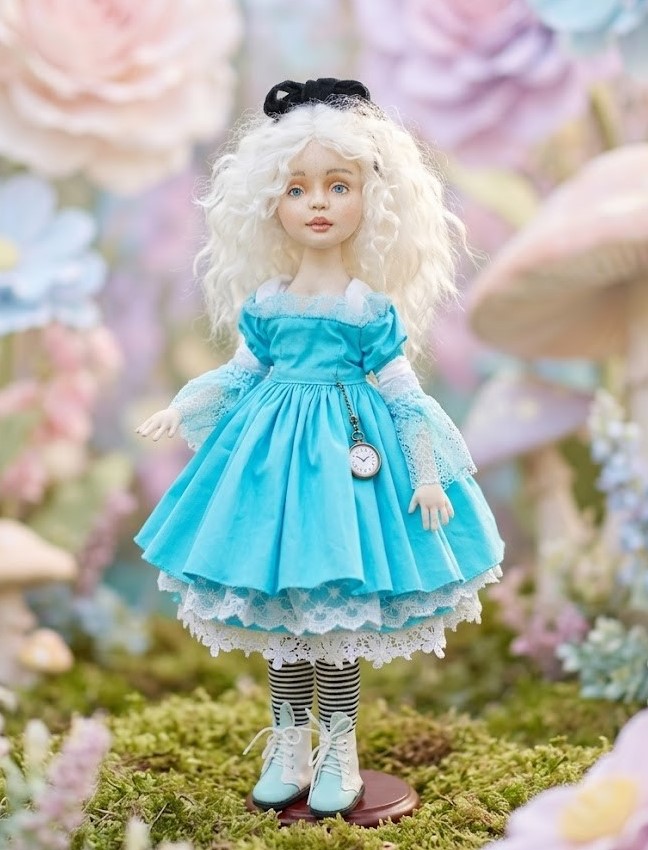 Моя Алиса в Стране Чудес.Текстильная куколка, выполнена в смешанной технике.Рост 53 см.Во всех суставах- шарики, волосы козочка.