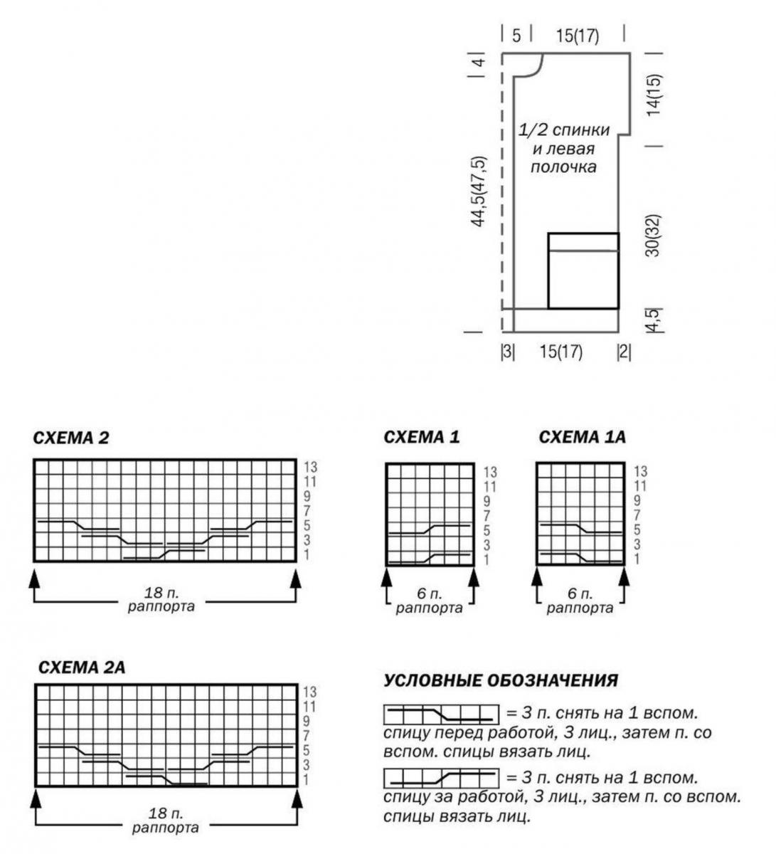 Правая полочка: вязать симметрично, вместо косы 1 выполнять косу 1а, вместо косы 2 — косу 2а.