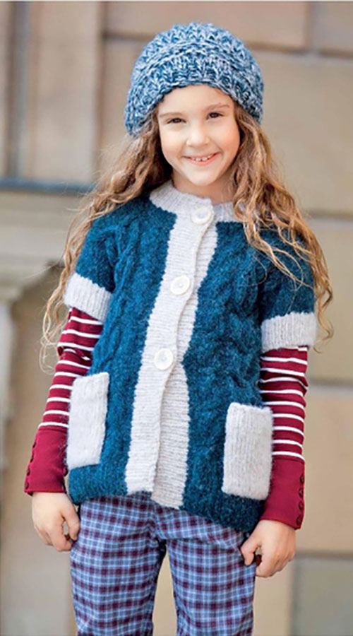 Сборка: выполнить плечевые швы. По краям рукавов на спицы № 5 белой нитью набрать по 56 п. Вязать 4 см резинкой, закрыть п. по-итальянски По вырезу горловины на спицы № 5 белой нитью набрать 53 п. Вязать 4 см резинкой, закрыть п. по-итальянски. По краям полочек белой нитью на спицы № 5 набрать по 100 п. Вязать резинкой, причём через 2 см на планке правой полочки выполнить 3 отверстия для пуговиц: 2 п. закрыть и снова набрать в след, р. 1-е отверстие расположить на расстоянии 2,5 см от верхнего края, остальные 2 — через 11,5 см друг от друга. Через 4 см от начала планки закрыть п. по-итальянски. Карманы пришить к полочкам. Выполнить боковые швы и швы рукавов. Пришить пуговицы.