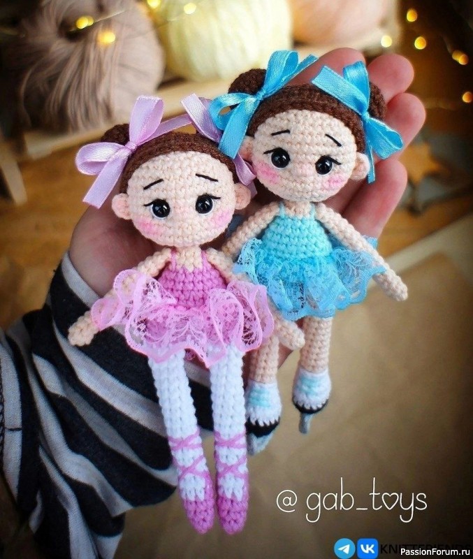 Знаете ли вы, что эти очаровательные вязаные куклы объединяют в себе грацию балета и изящество фигурного катания? Каждая куколка одета в миниатюрный костюм с кружевной юбочкой и украшена милыми бантиками. Одна из них даже в крошечных коньках, готовая выйти на лед.