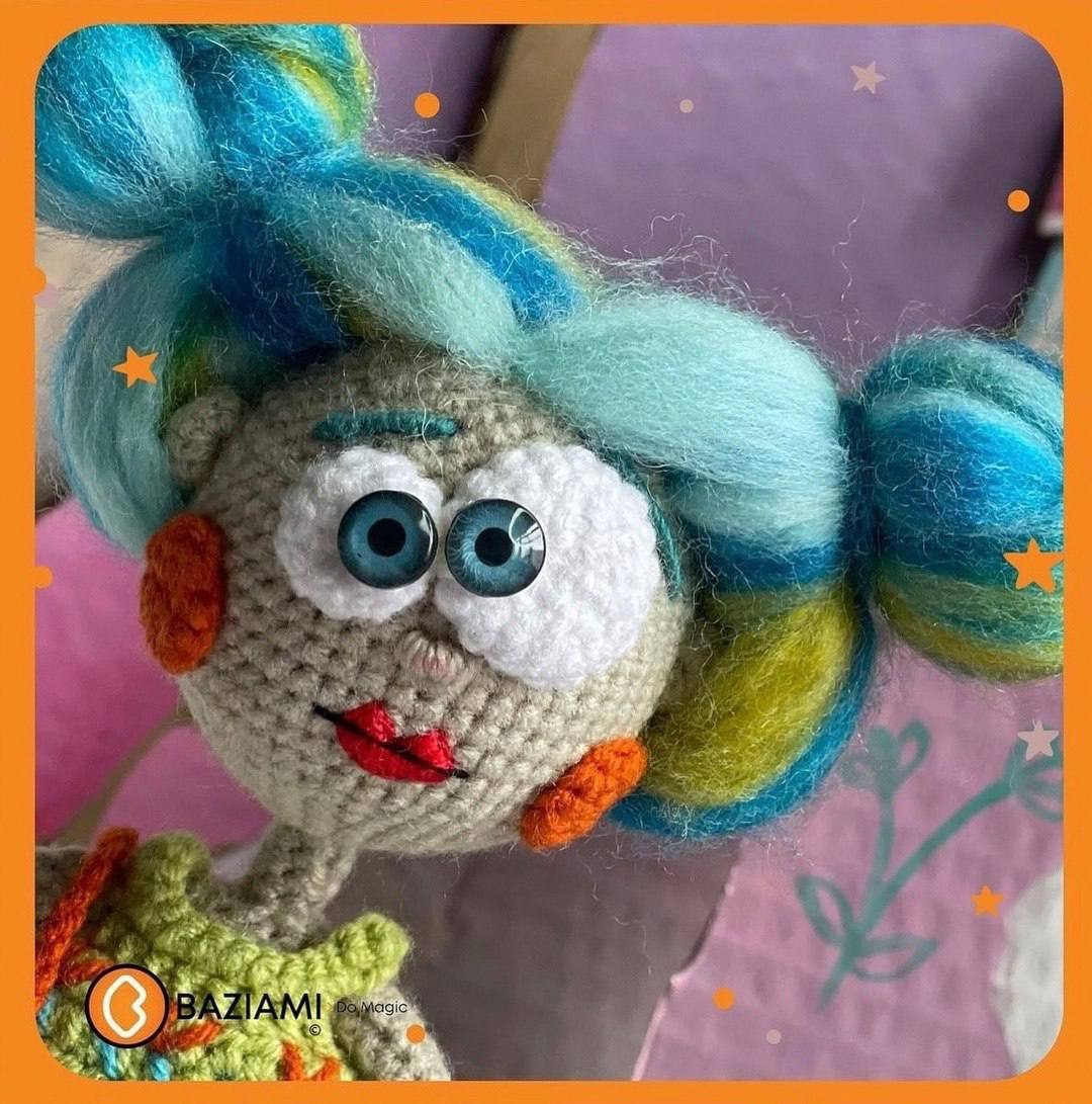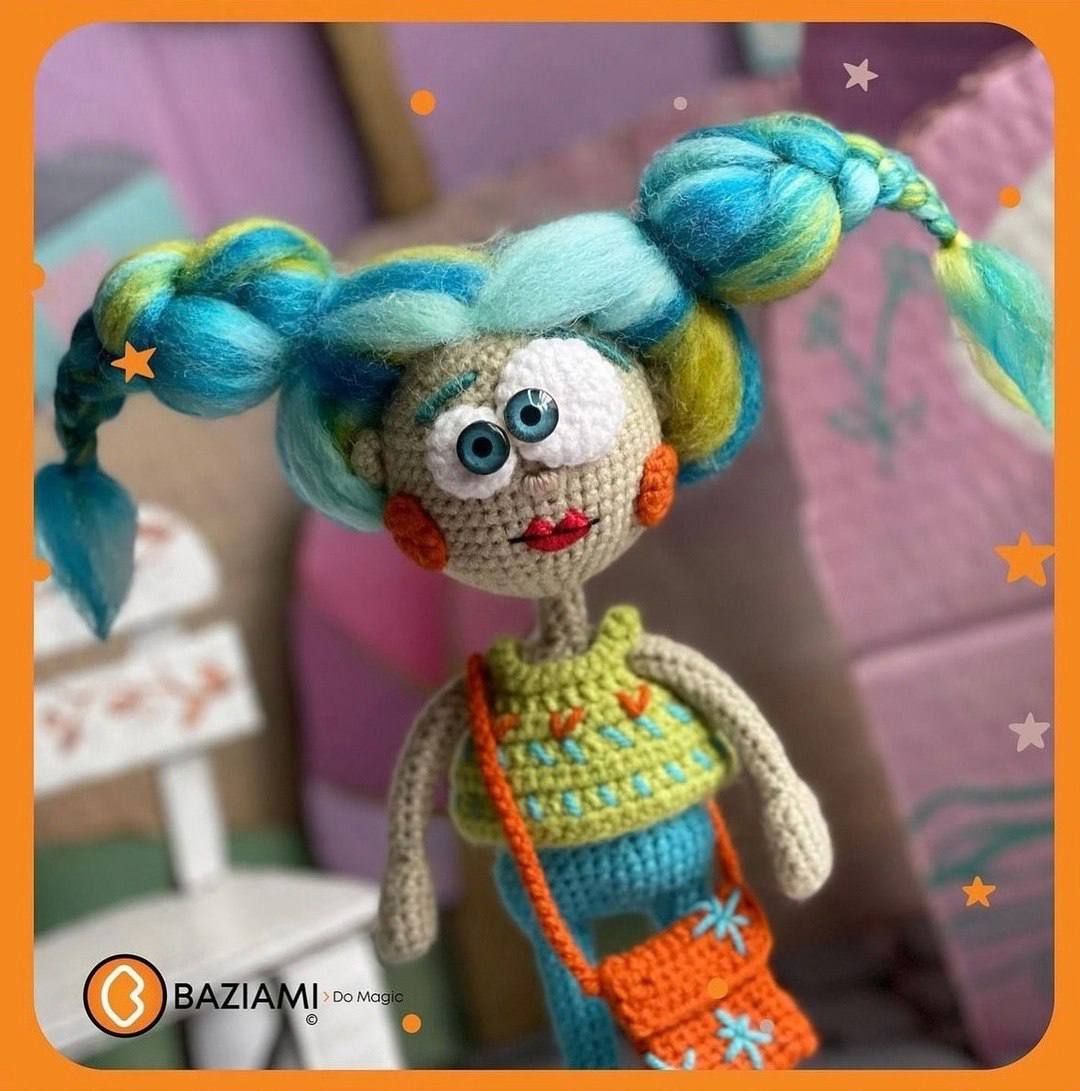 Эта очаровательная кукла амигуруми с забавными голубыми волосами и причудливым выражением лица явно знает толк в моде. В ярком топе и леггинсах она готова покорять мир своими длинными ногами и яркими оранжевыми ботинками.