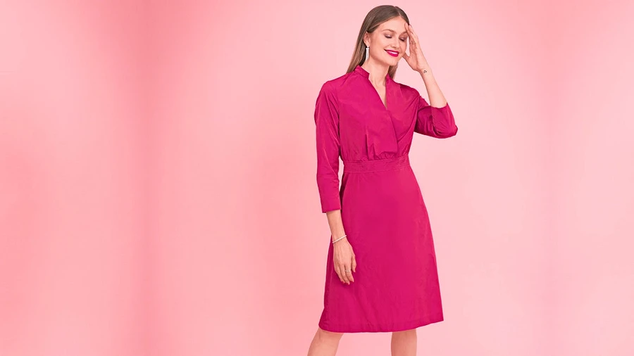 Воротник-стойка, присборенный лиф с эффектом запаха и аккуратным V-образным вырезом горловины — точно следуйте нашей пошаговой инструкции и сшейте это яркое элегантное платье.