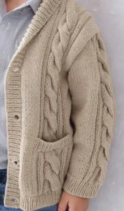 Модель жакета не сложная в исполнении, так как основа вязания, простая лицевая гладь. Украшением служат ряды узора из кос, проходящие по центру полочек и рукавов.