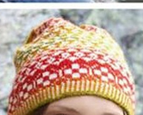 Описание работы: на круговые спицы набрать (начиная с зеленого фрагмента пряжи) 168 п., ряд замкнуть и для планки вязать по кругу 2 см = 7 р. резинкой. Работу продолжить жаккардовым узором. Через 19 см = 73 р. от планки вязать лицевой гладью нитью секционного крашения, при этом в 1-м р. отметить маркерами каждую 14-ю п. = 12 меток. В следующем ряду отмеченные петли провязать изнаночными. В следующем ряду начать убавки, дня этого петлю перед маркером провязать вместе с отмеченной изнаночной петлей лицевой с наклоном влево = 1 п. снять, как при лицевом вязании, следующую петлю провязать лицевой и снятую петлю протянуть через провязанную, следующую петлю провязать изнаночной. Эти убавки повторить еще 12 раз в каждом 2-м р., при этом по мере уменьшения количества петель перейти на чулочные спицы. Через 7 см = 27 р. от жаккардового узора = через 26 см = 100 р. от планки стянуть рабочей нитью оставшиеся 12 петель.