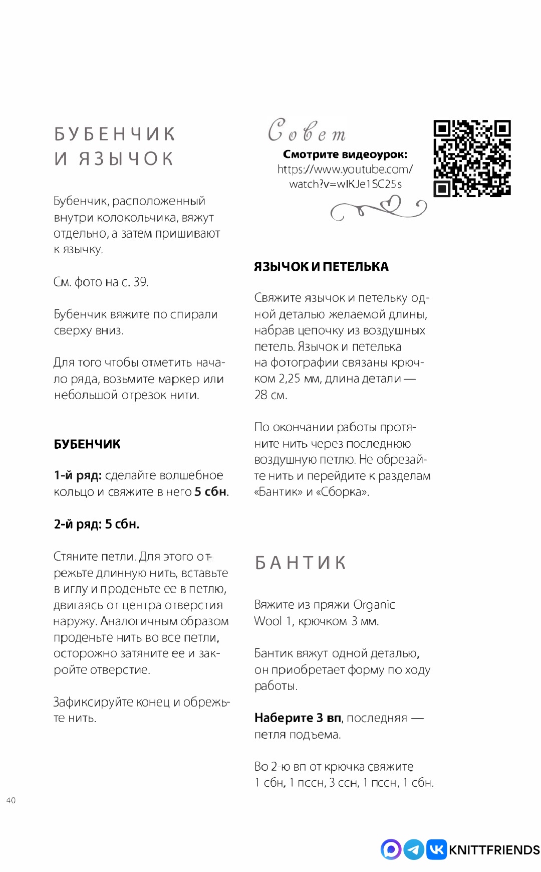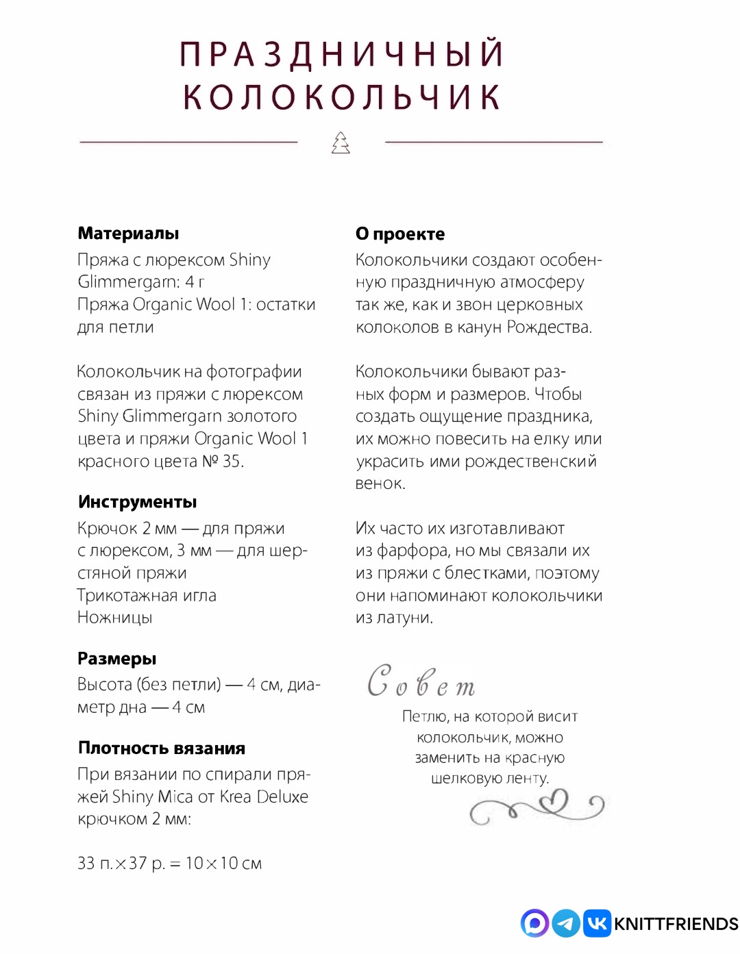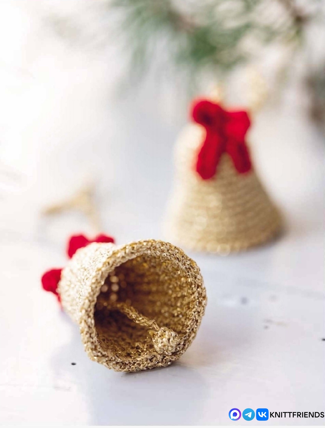 Колокольчик связан из пряжи с люрексом Shiny Glimmergarn золотого цвета и пряжи Organic Wool 1 красного цвета № 35,